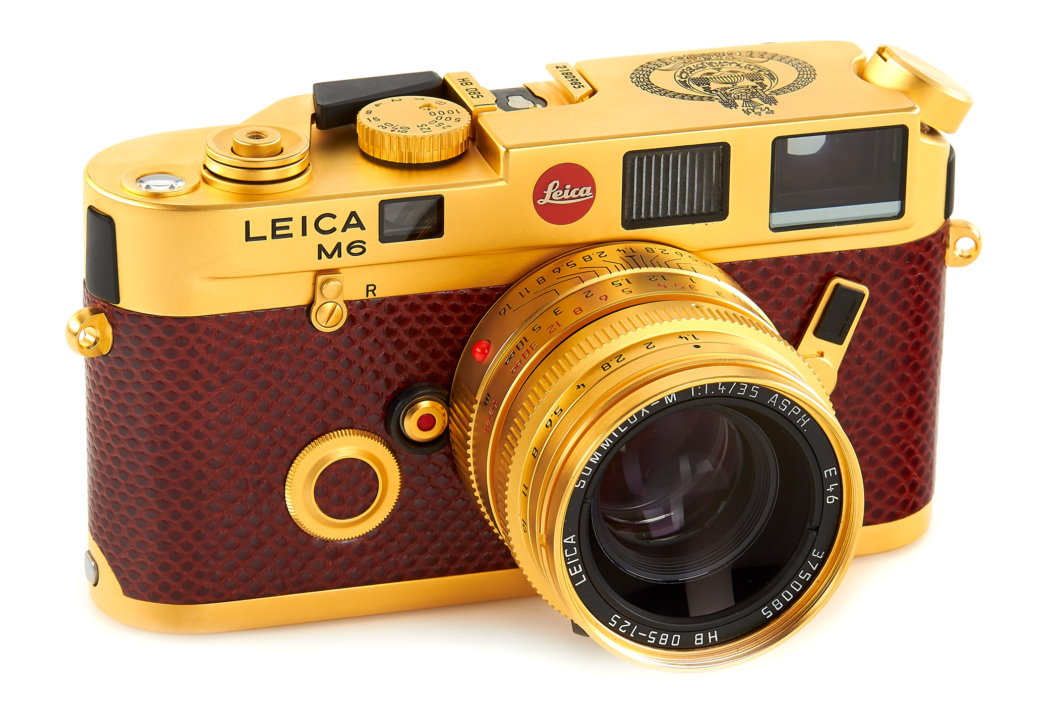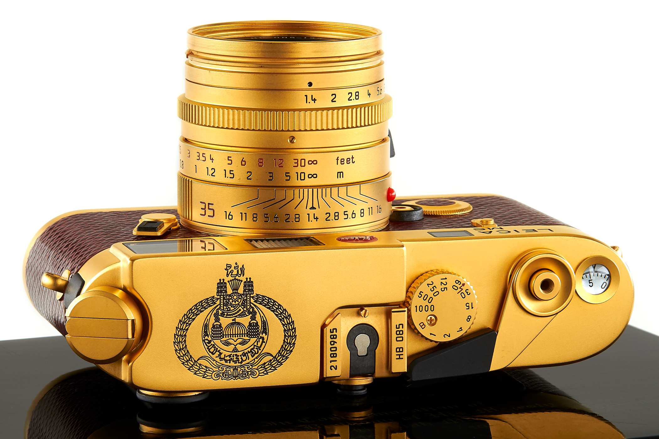 Ειδική έκδοση της χρυσής έκδοσης M6, που εκδόθηκε για τα 50α γενέθλια του Σουλτάνου του Μπρουνέι, σε άριστη κατάστασα, με επίχρυσο φακό Summilux 1.4 / 35mm ASPH αρ. 370085 (ελάχιστα σημάδια από ο hood), σε ειδικό ξύλινο κουτί . Έχουν εκδοθεί μόνο 125 από αυτά τα σπάνια σετ!