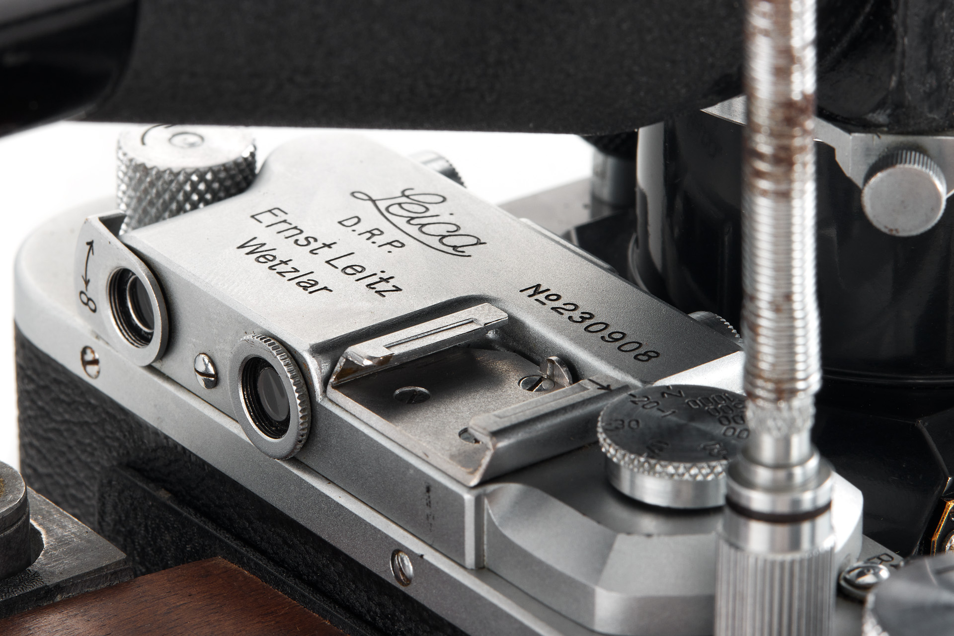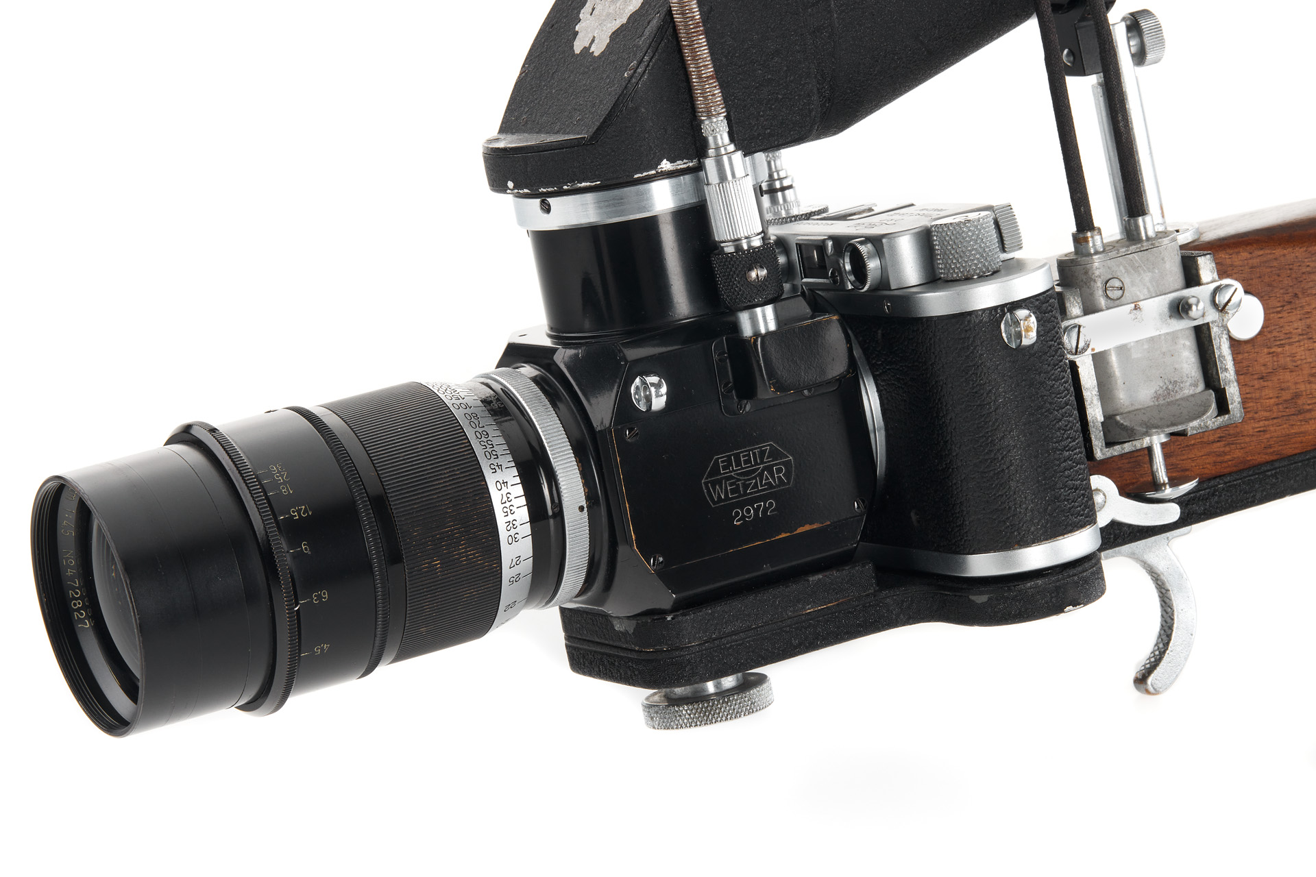 Ένα από τα πιο σπάνια και ασυνήθιστα αξεσουάρ της Leica σε εξαιρετική, πρωτότυπη κατάσταση. Η καταχώρηση αποτελείται από το ειδικό εικονοσκόπιο, χαραγμένο με σειριακό αριθμό 117 (βλ. Lager VOL.III για αρ.116) και «E.LEITZ INC. NEW-YORK», ένα τροποποιημένο περίβλημα PLOOT αριθ. 2972, τροποποιημένη Leica IIIa no.230908 (1937), φακός Telyt 4,5 / 20cm no. 472827 (κλίμακα εστίασης σε πόδια, με hood και καπάκι) και μια εξαιρετικά σπάνια θήκη μεταφοράς RIFUN.