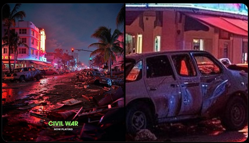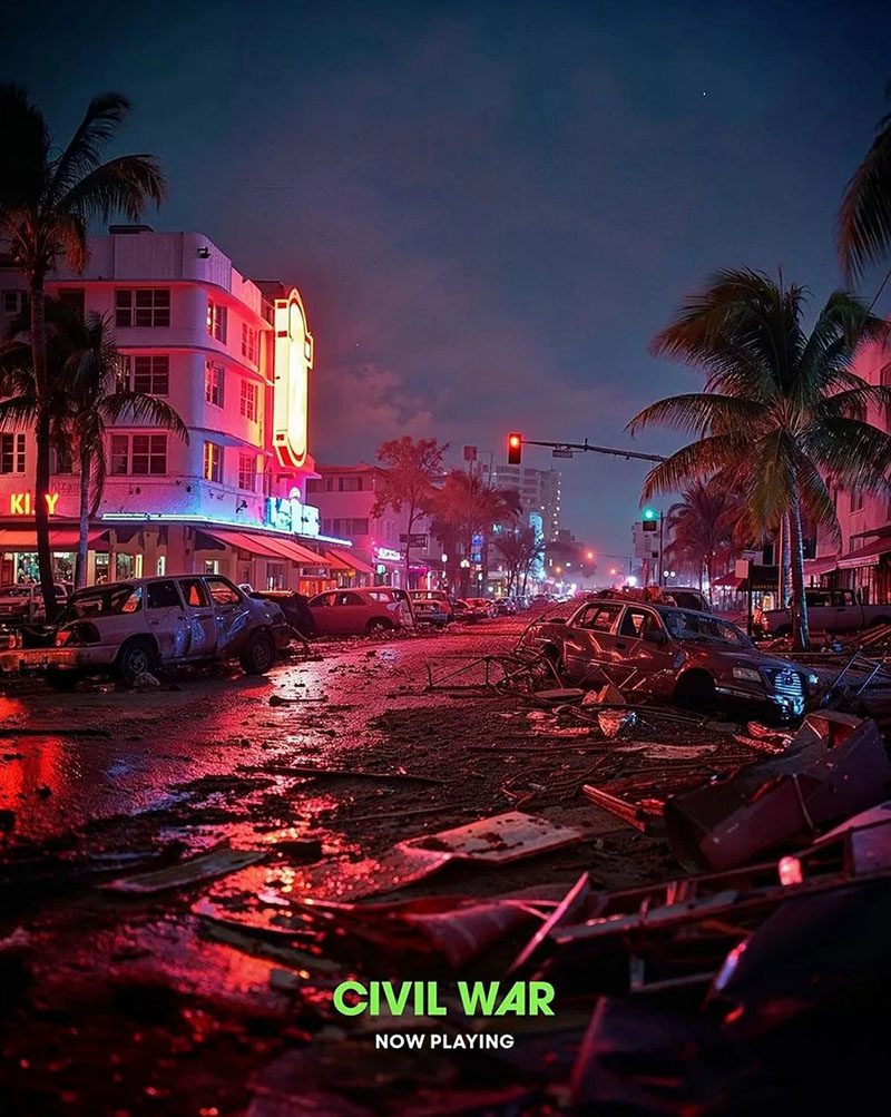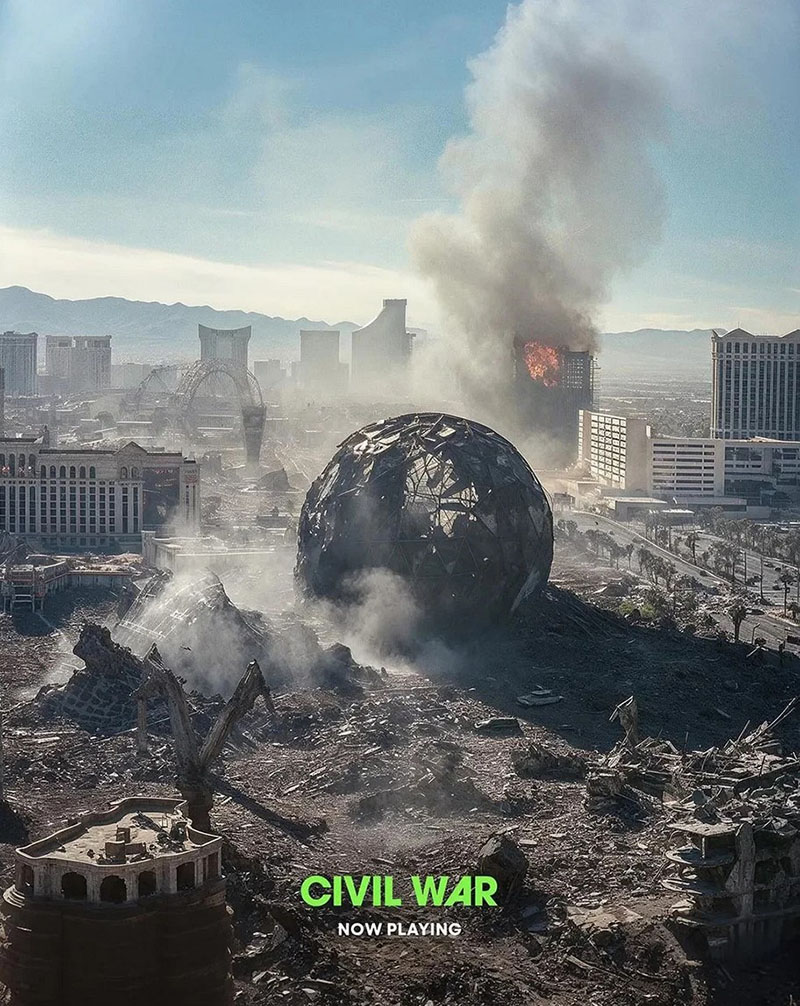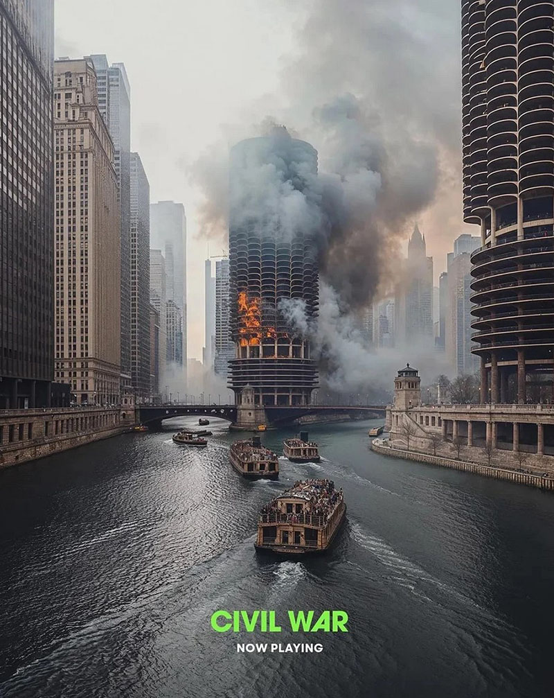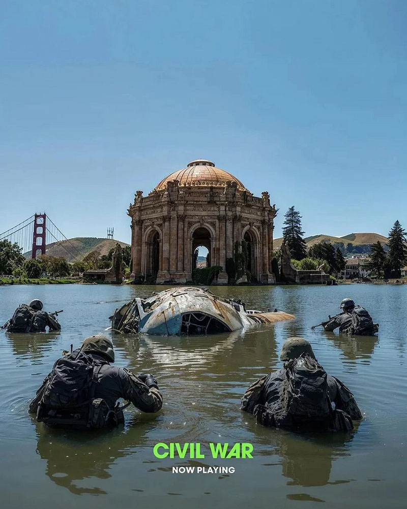 Το πρόβλημα είναι στα πόστερ της ταινίας που αποτελούν προωθητικό υλικό. Η A24 κυκλοφόρησε 5 αφίσες για να διαφημίσει την ταινία που απεικονίζουν “μετα-αποκαλυπτικές” σκηνές σε εμβληματικές πόλεις των ΗΠΑ που έχουν διαλυθεί από έναν υποθετικό καταστροφικό μοντέρνο εμφύλιο πόλεμο. Στις εικόνες βλέπουμε μεταξύ άλλων στρατιώτες να περιπολούν τη λίμνη έξω από το Παλάτι των Καλών Τεχνών του Σαν Φρανσίσκο και τη Σφαίρα του Λας Βέγκας να απεικονίζεται ως ένα κατεστραμμένο ναυάγιο. Σε άλλα πόστερ του Civil War βλέπουμε μια πλωτή μονάδα στρατιωτών σε μια λίμνη έξω από το Λος Άντζελες δίπλα από ένα τεράστιο κύκνο και τουριστικά σκάφη γεμάτα πρόσφυγες στον ποταμό του Σικάγο, ενώ στο βάθος φαίνονται κατεστραμμένα κτήρια. Δείτε τις εικόνες:
