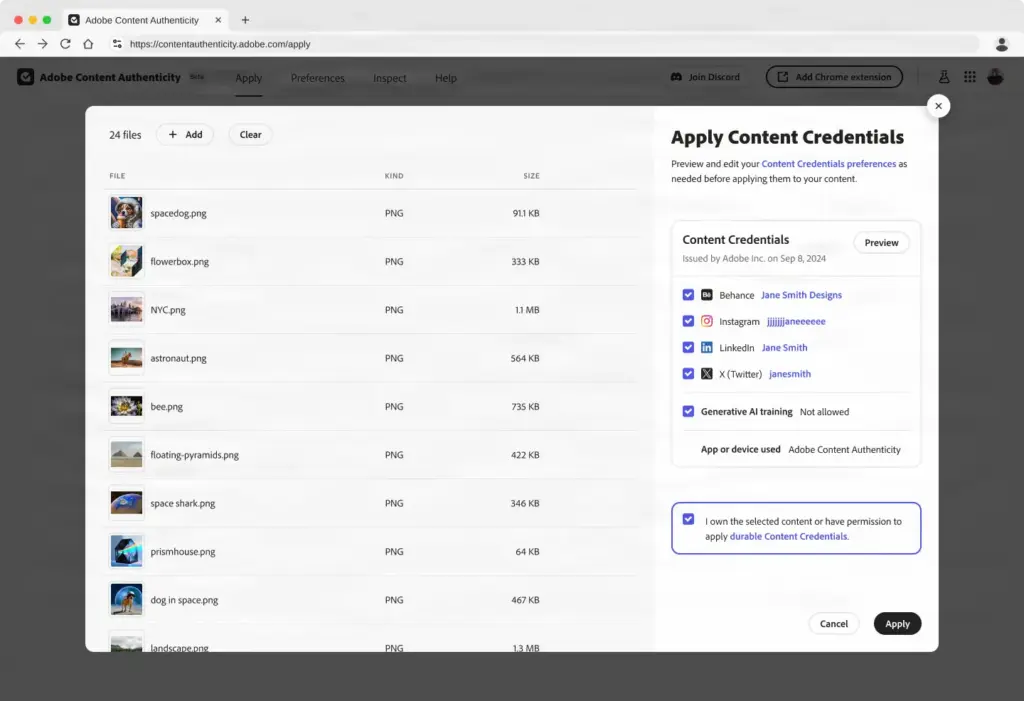 - Εφαρμογή Content Credentials: Εύκολη μαζική εφαρμογή των Content Credentials για σύνδεση πληροφοριών με το περιεχόμενο. Ο δημιουργός μπορεί να προσθέσει την επαληθευμένη ταυτότητα, την ιστοσελίδα και τους λογαριασμούς κοινωνικών μέσων.