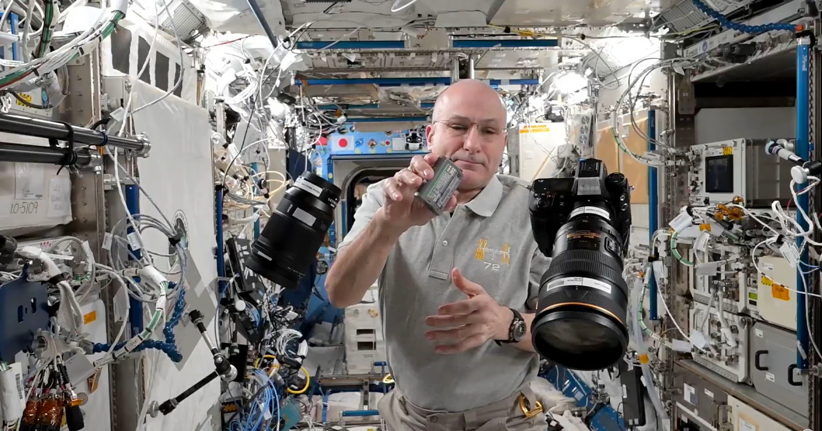 Στο σύντομο κλιπ, ο Pettit έχει παρατεταγμένα γύρω του ένα σώμα Nikon Z9, μια μπαταρία και έναν ευρυγώνιο φακό, όλα να αιωρούνται μέσα σε μονάδα του σταθμού. Πιάνει το σώμα, βγάζει τη μπαταρία και την αφήνει να «σταθεί» δίπλα στη φρέσκια, πριν την κουμπώσει στη θέση της.