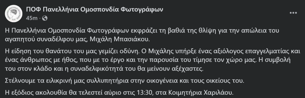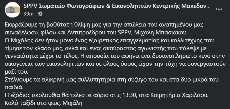Η απώλεια του Μιχάλη Μπασιάκου γεμίζει βαθιά θλίψη τη φωτογραφική κοινότητα.