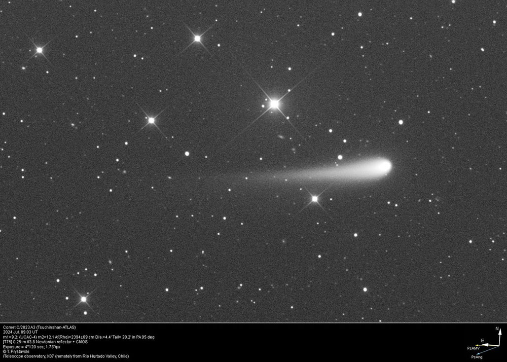 Αυτό σημαίνει ότι υπάρχουν ελπίδες ότι θα είναι ορατός ακόμη και με γυμνό μάτι σε αυτή τη φάση. Οι αστρονόμοι αναφέρουν ότι στις 12 Οκτωβρίου 2024 θα φτάσει στην κοντινότερη απόσταση από τη Γη, περίπου στα 70 εκατομμύρια χιλιόμετρα. Δείτε μια εικόνα του κομήτη Tsuchinchan-Atlas (C/2023 A3) που τραβήχτηκε στις 9 Ιουλίου από το παρατηρητήριο της κοιλάδας Rio Hurtado στη Χιλή: