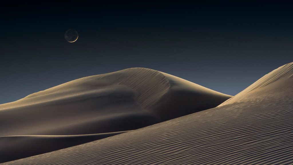 Περπάτησα αρκετά στους αμμόλοφους και τελικά βρήκα τι θα βάλω σε πρώτο πλάνο, κάτι που είχα φανταστεί για αυτή τη λήψη. Καθώς έστηνα τον εξοπλισμό μου, το κόκκινο του ηλιοβασιλέματος έσβησε στο μπλε λυκόφως. Μόλις συγκεντρώθηκαν όλα, κοίταξα ψηλά και είδα μια λαμπερή λωρίδα ενός μισοφέγγαρου που σκιαγραφούσε το σκοτεινό αλλά ορατό πρόσωπό του. Μετά από μία παύση για να απολαύσω το θέαμα, ασχολήθηκα με την φωτογράφιση.