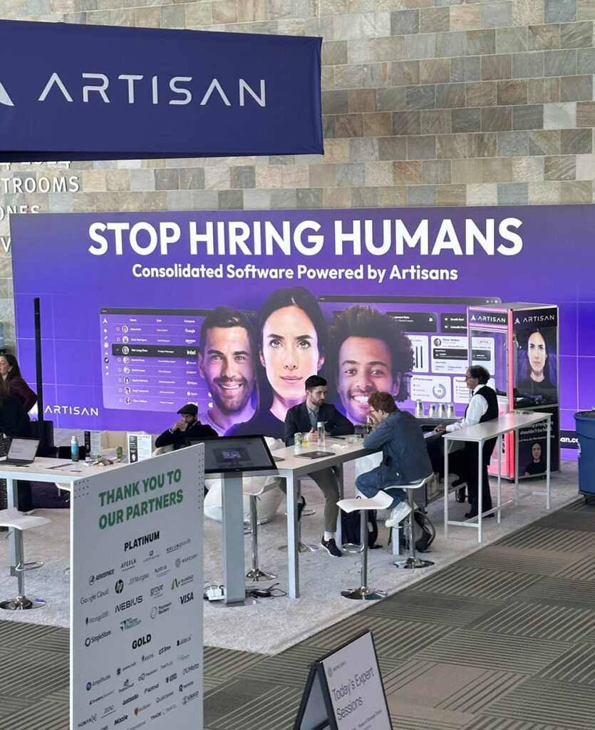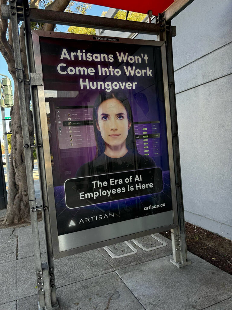 Οι διαφημίσεις πολλές φορές δείχνουν ένα AI bot που έχει μορφή γυναίκας το οποίο ονομάζεται “Ava” και τα μηνύματα που περνάνε έχουν πραγματικά θορυβήσει τους κατοίκους της πόλης. Στην παραπάνω εικόνα η διαφήμιση φέρει το μήνυμα “Να προσλαμβάνετε Artisans, όχι ανθρώπους” (AI bots δηλαδή της εταιρίας). Ένα άλλο λέει το εξής: “Οι Artisans δε θα παραπονεθούν για την ισορροπία μεταξύ επαγγελματικής και προσωπικής ζωής”. Στην παρακάτω εικόνα φαίνεται μια μεγάλη διαφήμιση της Artisan AI σε στάση λεωφορείου που φέρει το μήνυμα: “Οι Artisans δε θα έρθουν ποτέ στη δουλειά κουρασμένοι” (Hungover αναφέρει που εννοεί ότι οι άνθρωποι πολλές φορές δεν μπορούν να λειτουργήσουν ορισμένα πρωινά σωστά επειδή τα προηγούμενα βράδια έπιναν αλκοόλ και γλεντούσαν μέχρι αργά!).