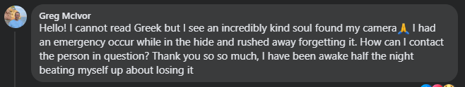 Γειά! Δεν μπορώ να διαβάσω ελληνικά, αλλά βλέπω μια απίστευτα ευγενική ψυχή που βρήκε την κάμερά μου. Μου συνέβη μια έκτακτη ανάγκη ενώ ήμουν στο hide και έτρεξα με αποτέλεσμα να την ξεχάσω. Πώς μπορώ να επικοινωνήσω με το εν λόγω άτομο; Ευχαριστώ πολύ, έμεινα ξύπνιος τη μισή νύχτα και ταλαιπωρήθηκα γιατί την έχασα.