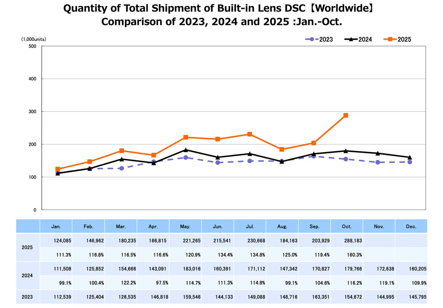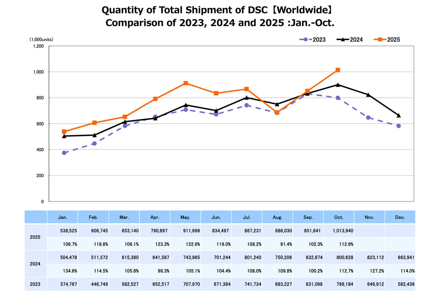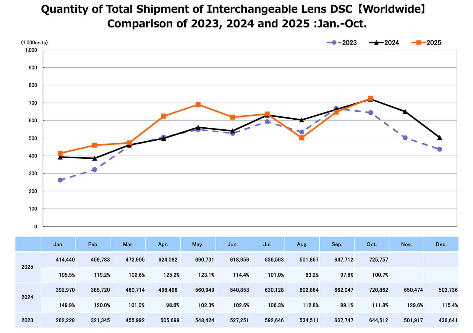 Τα νέα στοιχεία της CIPA (Camera & Imaging Products Association), του πιο αξιόπιστου οργανισμού για την αποτύπωση της κατάστασης της φωτογραφικής βιομηχανίας, επιβεβαιώνουν ότι το 2025 εξελίσσεται σε μια χρονιά-καμπή. Παρά το αρνητικό καλοκαίρι και την παγκόσμια οικονομική αβεβαιότητα, οι αποστολές ψηφιακών φωτογραφικών μηχανών και φακών αυξήθηκαν έντονα από τον Σεπτέμβριο στον Οκτώβριο, ξεπερνώντας κάθε αντίστοιχο μήνα από τις αρχές του 2023.