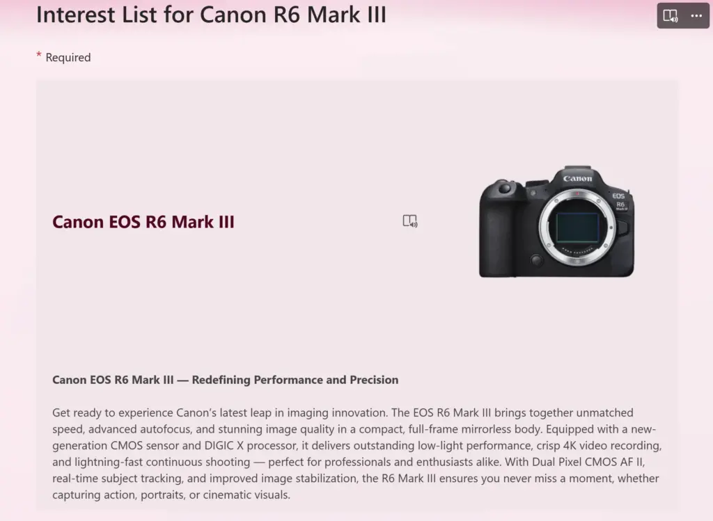Σύμφωνα με το Canon Rumors, προωθητικό υλικό και μια φωτογραφία που εμφανίστηκαν προσωρινά στο Instagram καταστήματος (πριν αποσυρθούν), δείχνουν πως η R6 Mark III βρίσκεται πλέον προ των πυλών. Οι διαρροές επιβεβαιώνουν ότι η ανακοίνωση αναμένεται στις 6 Νοεμβρίου 2025, ενώ η διάθεση θα ξεκινήσει στις 20 Νοεμβρίου.