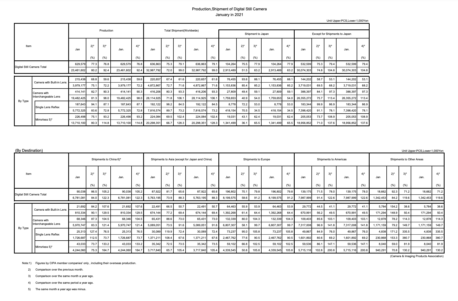 Συγκρίνοντας με το 2020 η παραγωγή των DSLR μειώθηκε κατά -12.9%, ενώ των mirrorless κατά -6.8%.