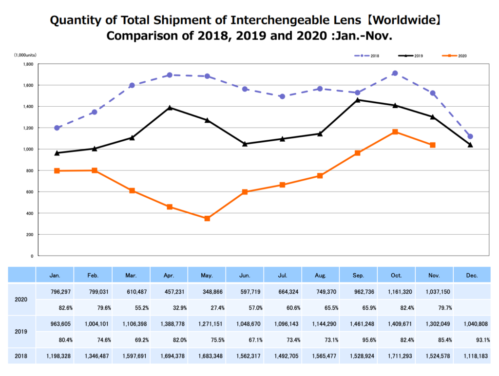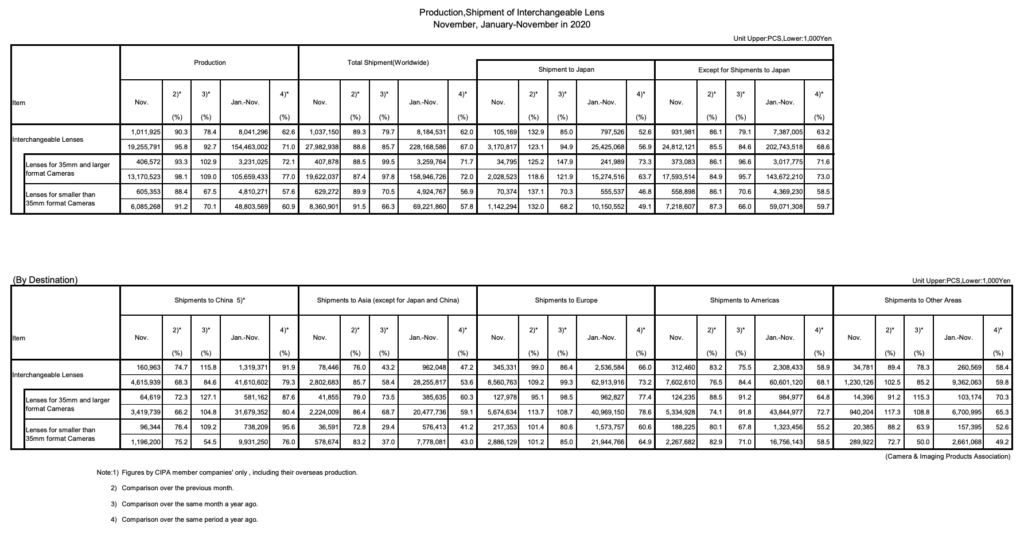 Όσο αγορά την παραγωγή φακών, τον Νοέμβριο συνολικά είχαμε 1,011,925 φακούς, από τους οποίους οι 406,572 φακοί είναι για Full Frame κάμερες και μεγαλύτερα φορμά και οι 605,353 για φορμά μικρότερα του Full Frame, δηλαδή για κάμερες APS-C και MFT (υπενθυμίζουμε ότι μιλάμε για Ιαπωνικές εταιρείες μόνο).