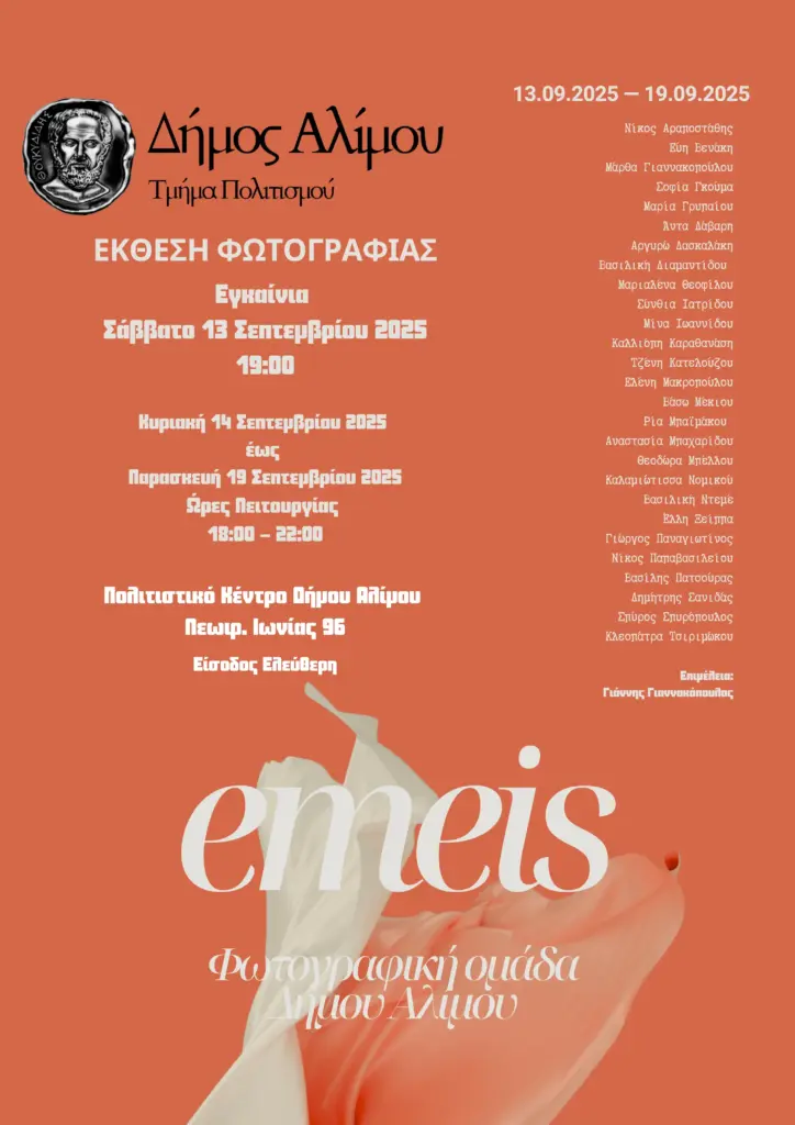 Η Φωτογραφική Ομάδα του Δήμου Αλίμου, Τμήμα Πολιτισμού, παρουσιάζει την ομαδική έκθεση φωτογραφίας με τίτλο “emeis”, με εγκαίνια το Σάββατο 13 Σεπτεμβρίου 2025 στις 19:00 στο Πολιτιστικό Κέντρο του Δήμου Αλίμου (Λεωφ. Ιωνίας 96).