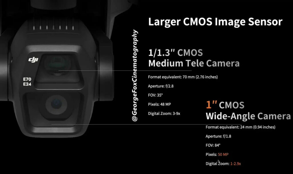 - Ο ευρυγώνιος φακός του Air 3S χρησιμοποιεί μεγαλύτερο 1″ CMOS αισθητήρα, σε σύγκριση με τον 1/1.3″ αισθητήρα του Air 3.