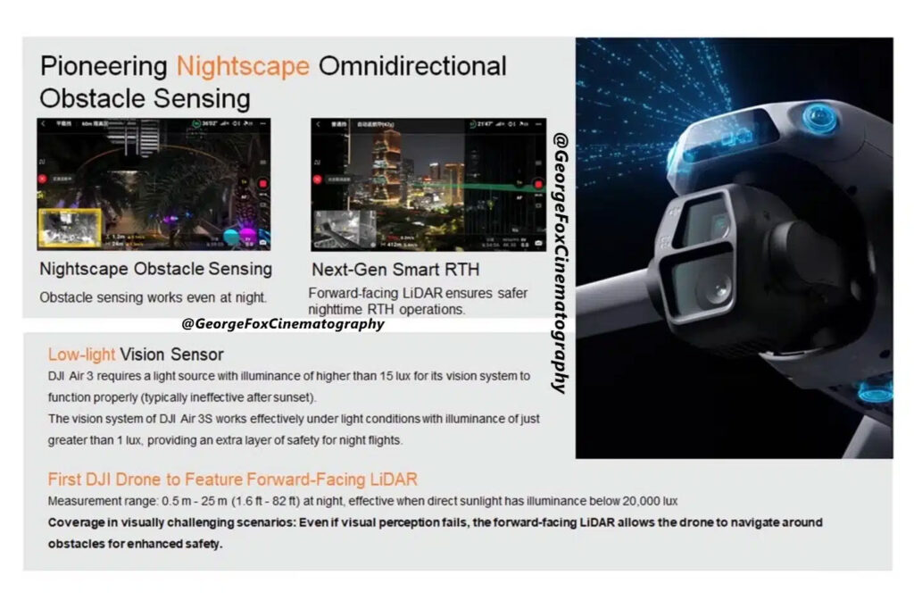 Σύμφωνα με τις διαρροές, οι εμπρόσθιοι αισθητήρες LiDAR στο Air 3S έχουν εμβέλεια μέτρησης από 0.5 μ. έως 25 μ. τη νύχτα. Λειτουργεί αποτελεσματικά σε μέτρια ηλιοφάνεια.