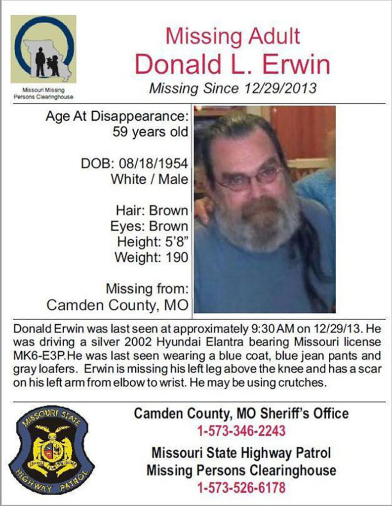 Οι ιατροδικαστές εξετάζουν ακόμη τα λείψανα για να προσδιορίσουν αν είναι σίγουρα του Donnie Erwin, αλλά από το τεχνητό ισχίο που βρέθηκε είναι βέβαιοι ότι τόσο το ισχίο όσο και τα λείψανα που βρέθηκαν ανήκουν σε αυτόν.