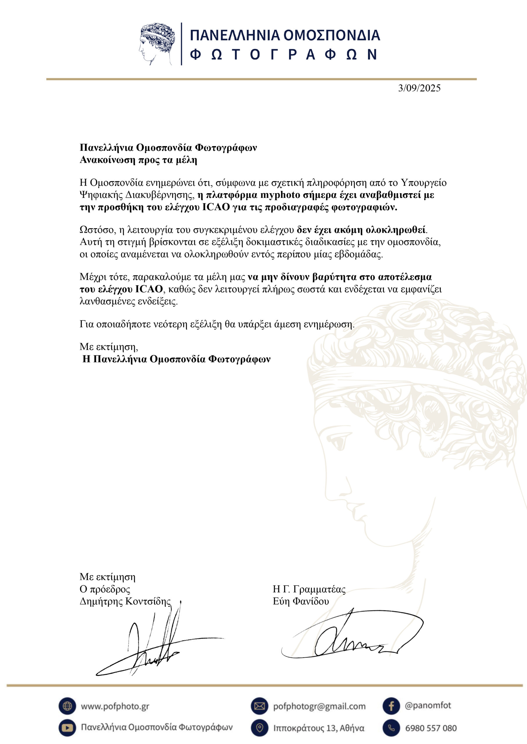 Η Πανελλήνια Ομοσπονδία Φωτογράφων εξέδωσε ανακοίνωση προς τα μέλη της σχετικά με την αναβάθμιση της πλατφόρμας myphoto, η οποία σύμφωνα με το Υπουργείο Ψηφιακής Διακυβέρνησης ενισχύθηκε με την προσθήκη του ελέγχου ICAO για τις προδιαγραφές φωτογραφιών.