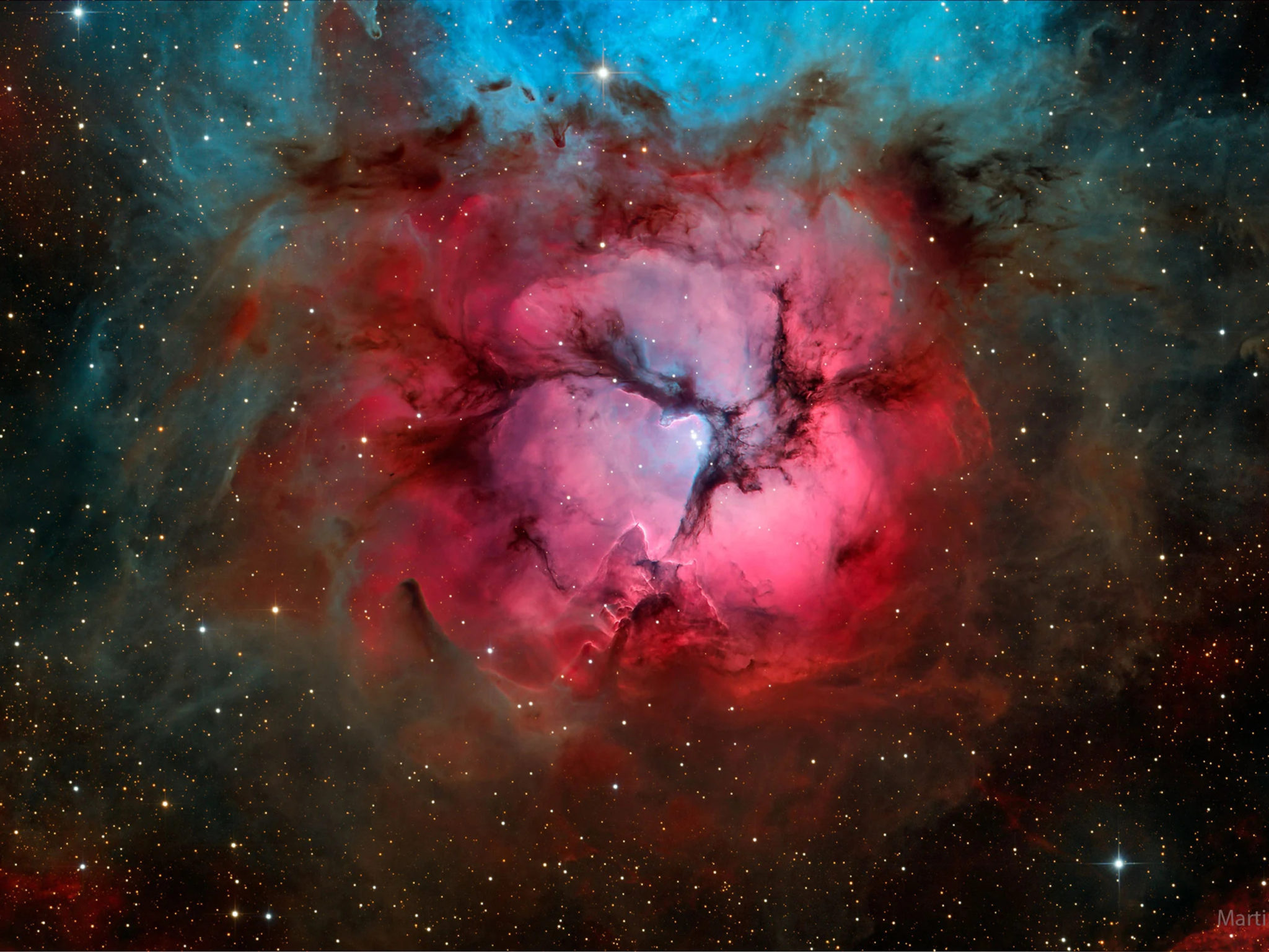 Το νεφέλωμα Trifid (ή αλλιώς M20) διαθέτει τρεις εντυπωσιακές λωρίδες σκόνης, οι οποίες δίνουν στο νεφέλωμα το όνομά του. Όλες μαζί έρχονται σε επαφή και σχηματίζουν μια μαγευτική απεικόνιση.