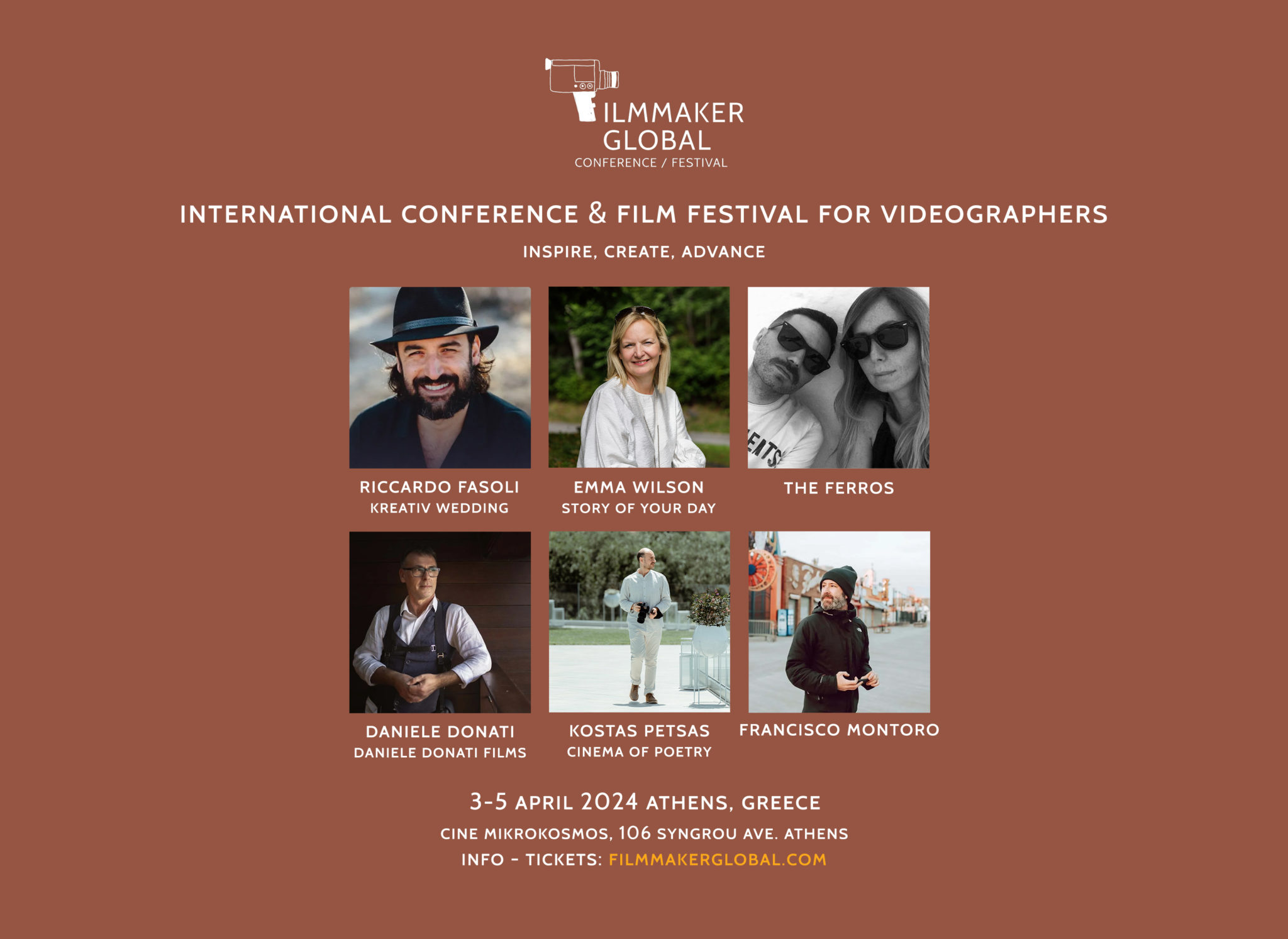 Το πρώτο μεγάλο διεθνές φεστιβάλ και συνέδριο για βιντεογράφους, με τίτλο Filmmaker Global, θα πραγματοποιηθεί από τις 3 έως και τις 5 Απριλίου στην Αθήνα. Διοργανωτές της εκδήλωσης είναι οι διεθνώς αναγνωρισμένοι βιντεογράφοι Κωνσταντίνος Πέτσας (Cinema of Poetry) και Daniele Donati, ο οποίος διατελεί πρόεδρος της Ιταλικής Ενωσης Βιντεογράφων ANV.