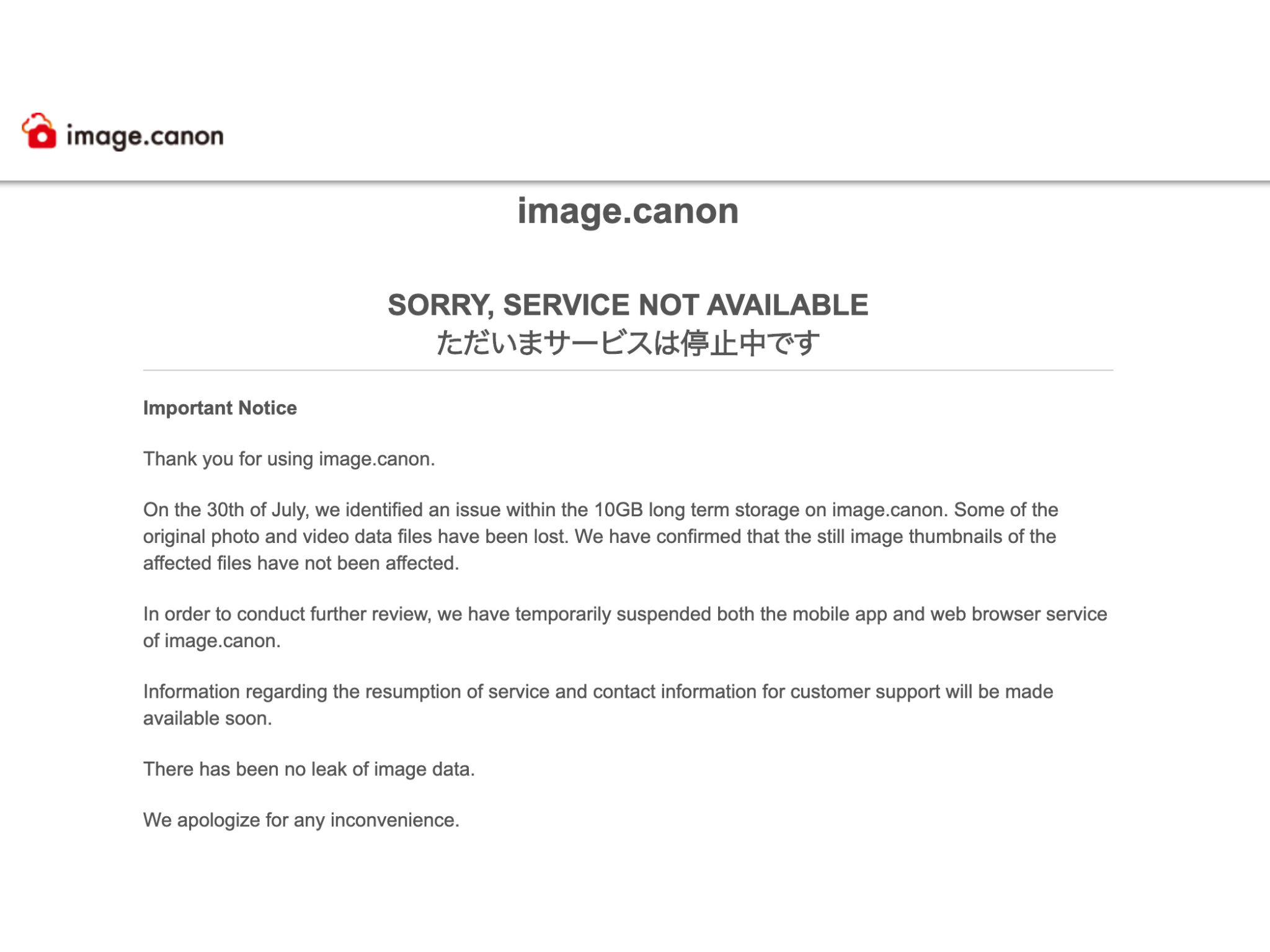 Στις 30 Ιουλίου, εντοπίσαμε ένα πρόβλημα στον μακροπρόθεσμο χώρο αποθήκευσης των 10 GB στο image.canon. Μερικά από τα αρχικά αρχεία φωτογραφιών και βίντεο έχουν χαθεί. Επιβεβαιώσαμε ότι οι μικρογραφίες φωτογραφιών των επηρεαζόμενων αρχείων δεν έχουν επηρεαστεί.
