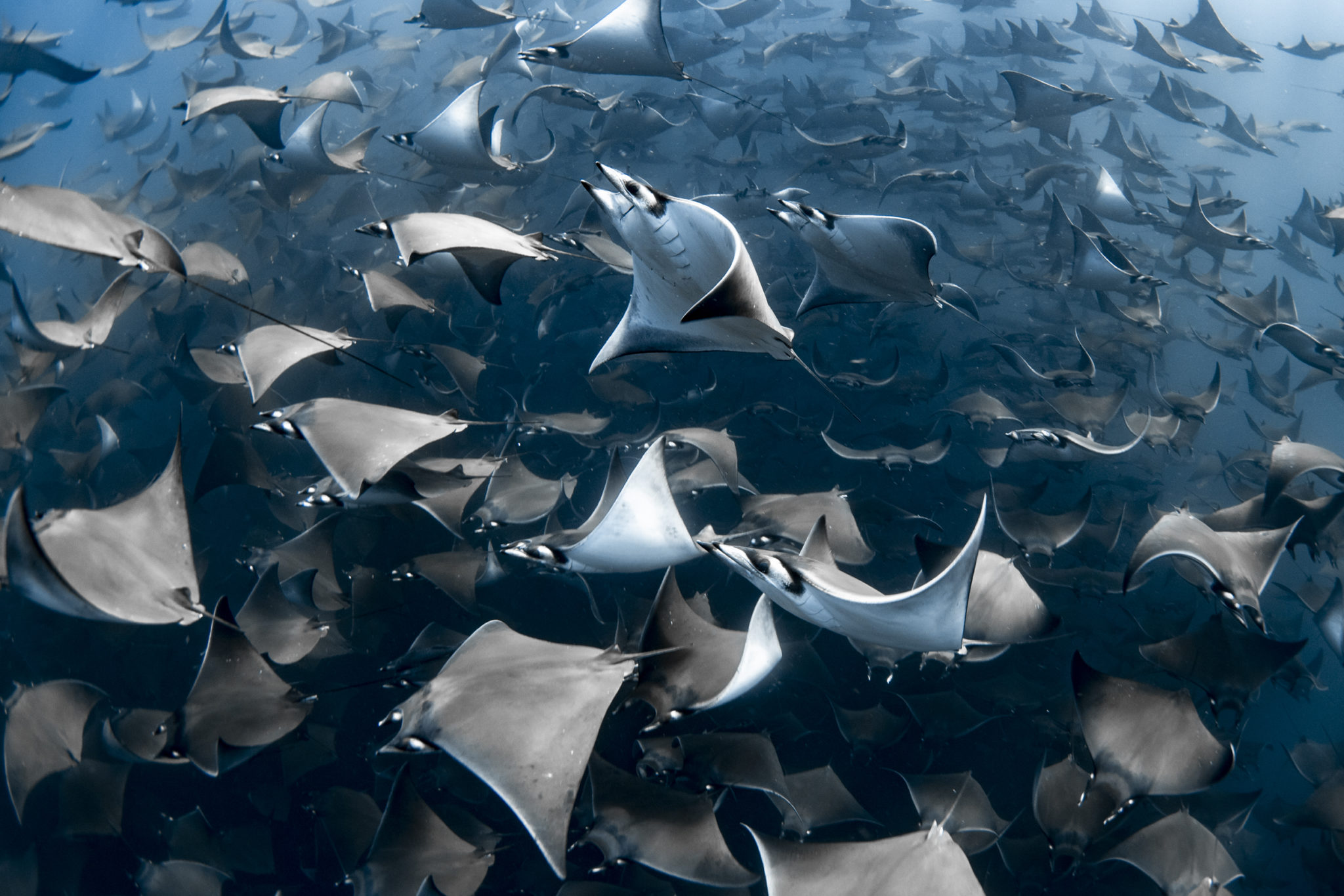H φωτογραφία της απεικονίζει μία συγκέντρωση mobula σε καθαρά νερά στα ανοικτά του Baja California Sur, στο Μεξικό.