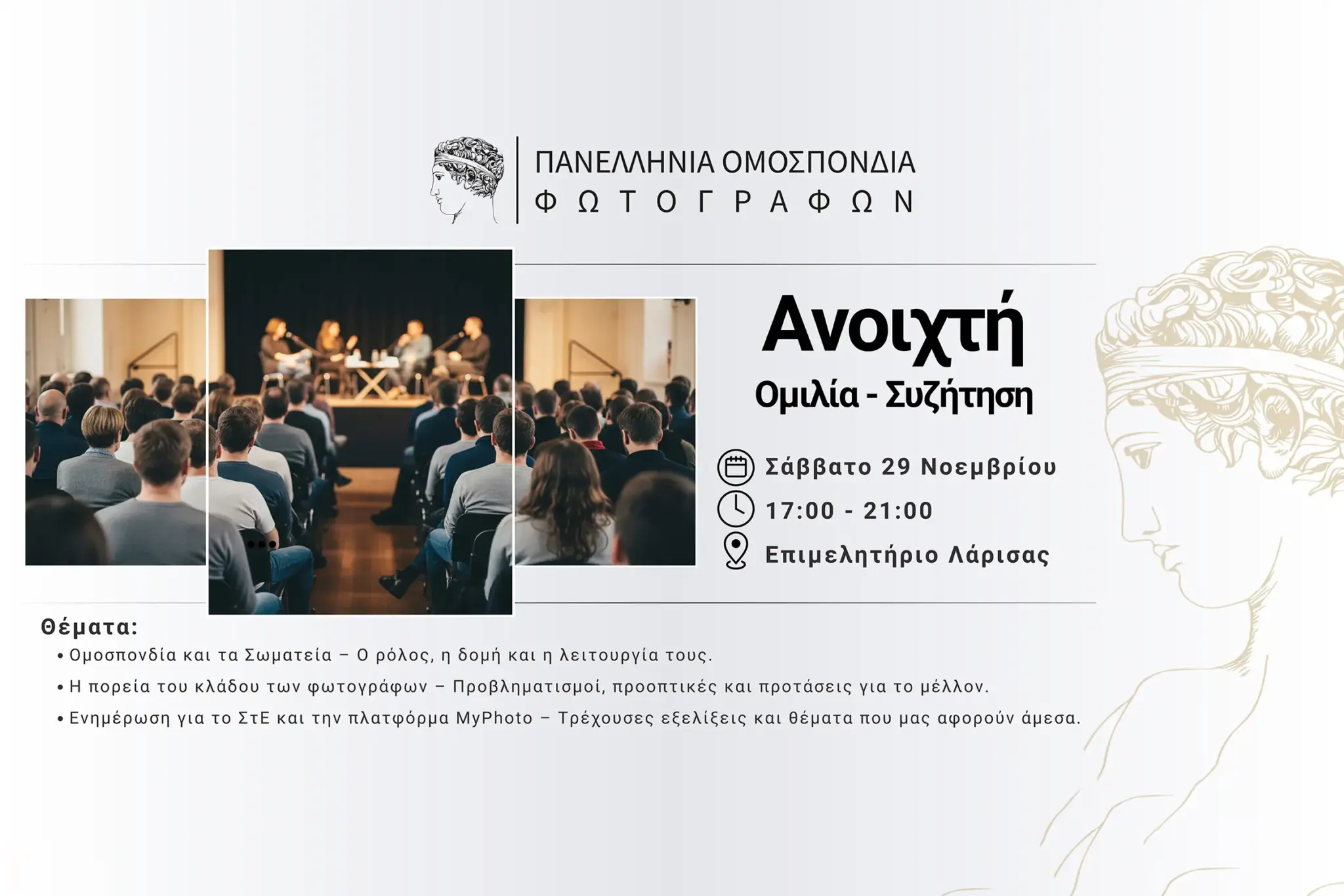 Η Πανελλήνια Ομοσπονδία Φωτογράφων προσκαλεί όλους τους επαγγελματίες φωτογράφους σε ανοιχτή ομιλία – συζήτηση, το Σάββατο 29 Νοεμβρίου, από τις 17:00 έως τις 21:00, στο Επιμελητήριο Λάρισας.