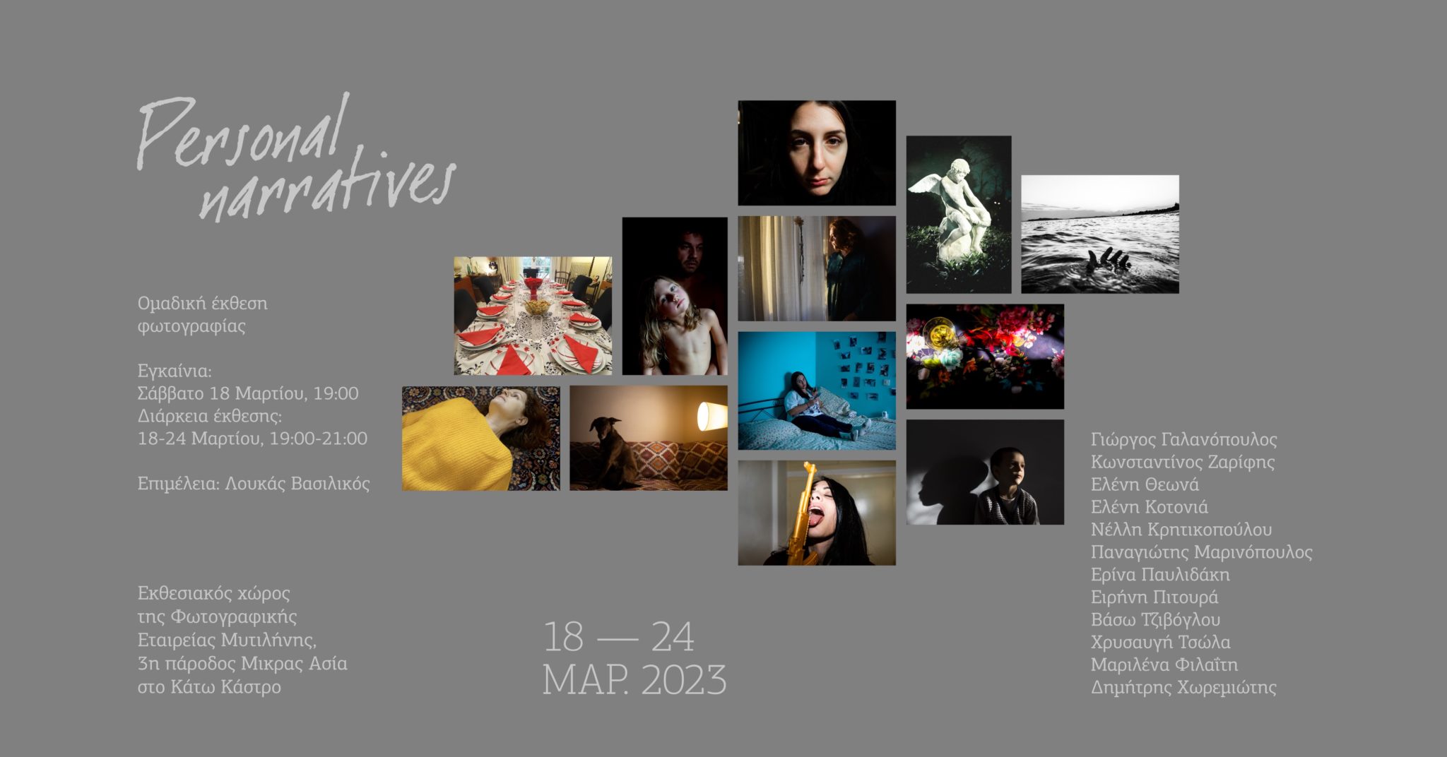 Η Φωτογραφική Εταιρεία Μυτιλήνης έχει τη χαρά να φιλοξενεί την ομαδική φωτογραφική έκθεση σε επιμέλεια του γνωστού φωτογράφου Λουκά Βασιλικού, με τίτλο Personal Narratives.