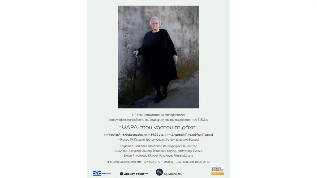 Με αφορμή την έκδοση του ομώνυμου φωτογραφικού λευκώματος, η Τέτυ Παπαναστασίου παρουσιάζει μια επιλογή εικόνων από την εργασία της με τίτλο Ψαρά, στου νόστου τη ράχη της. Η έκθεση θα πραγματοποιηθεί το διάστημα από 15 έως 21 Φεβρουαρίου 2026 στην Δημοτική Πινακοθήκη Πειραιά.