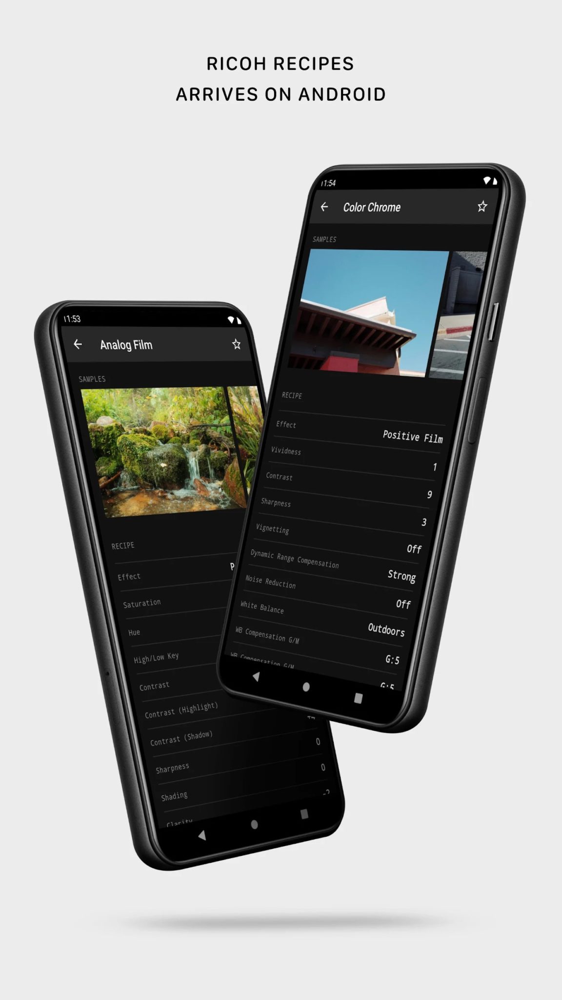 Το Ricoh Recipes είναι μια δωρεάν εφαρμογή που σας δίνει πρόσβαση σε περισσότερες από 40 συνταγές JPEG για κάμερες Ricoh GR! Αυτές οι ρυθμίσεις JPEG σας επιτρέπουν να έχετε διάφορες εμφανίσεις κατευθείαν από την κάμερα, πολλές εμπνευσμένες από τα φωτογραφικά film και την αναλογική αισθητική.