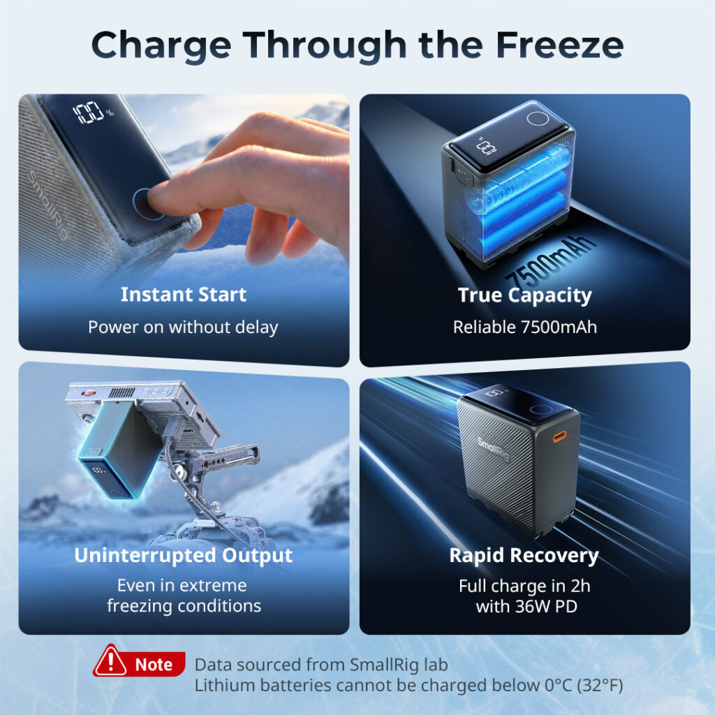 Οι μπαταρίες ιόντων λιθίου χάνουν δραματικά την απόδοσή τους όσο πέφτει η θερμοκρασία. Η SmallRig δηλώνει ότι η συγκεκριμένη NP-F970 αποφορτίζεται κανονικά ακόμη και στους -40°C, διατηρώντας σταθερή παροχή ρεύματος όταν άλλες μπαταρίες αδειάζουν «ξαφνικά» μέσα σε λίγα λεπτά.