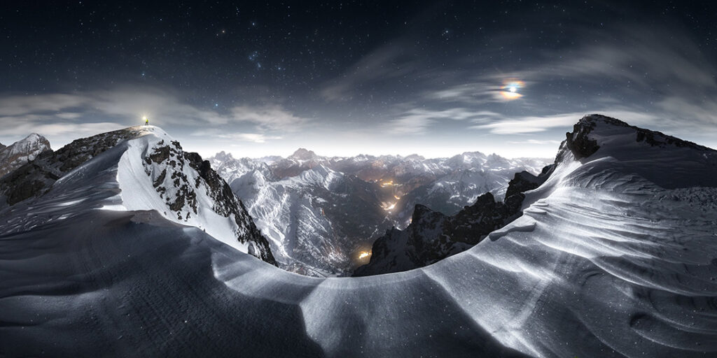 «Εδώ και χρόνια με συναρπάζει ο τρόπος που το φως της σελήνης αποκαλύπτει κάθε υφή του χιονιού, κάθε σχέδιο που σχηματίζει ο άνεμος. Για να ζωντανέψω αυτή την εικόνα, εργάστηκα όλη τη νύχτα στους -15°C με Sony A6600 και φακό 10mm fisheye στο f/5.6, 10 δευτερόλεπτα, ISO 1250, δημιουργώντας ένα πανόραμα 270° μέσα στον παγωμένο άνεμο».