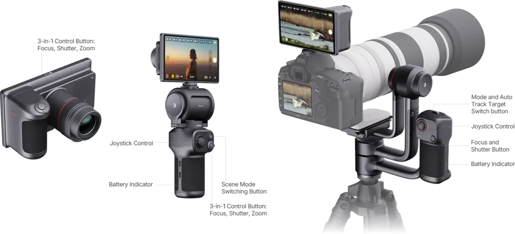 • ως «AI tracker» που τοποθετείται πάνω στο hot shoe και αναλαμβάνει να γυρίζει το κύριο σώμα της φωτογραφικής μηχανής για να διατηρεί το θέμα στο κάδρο.