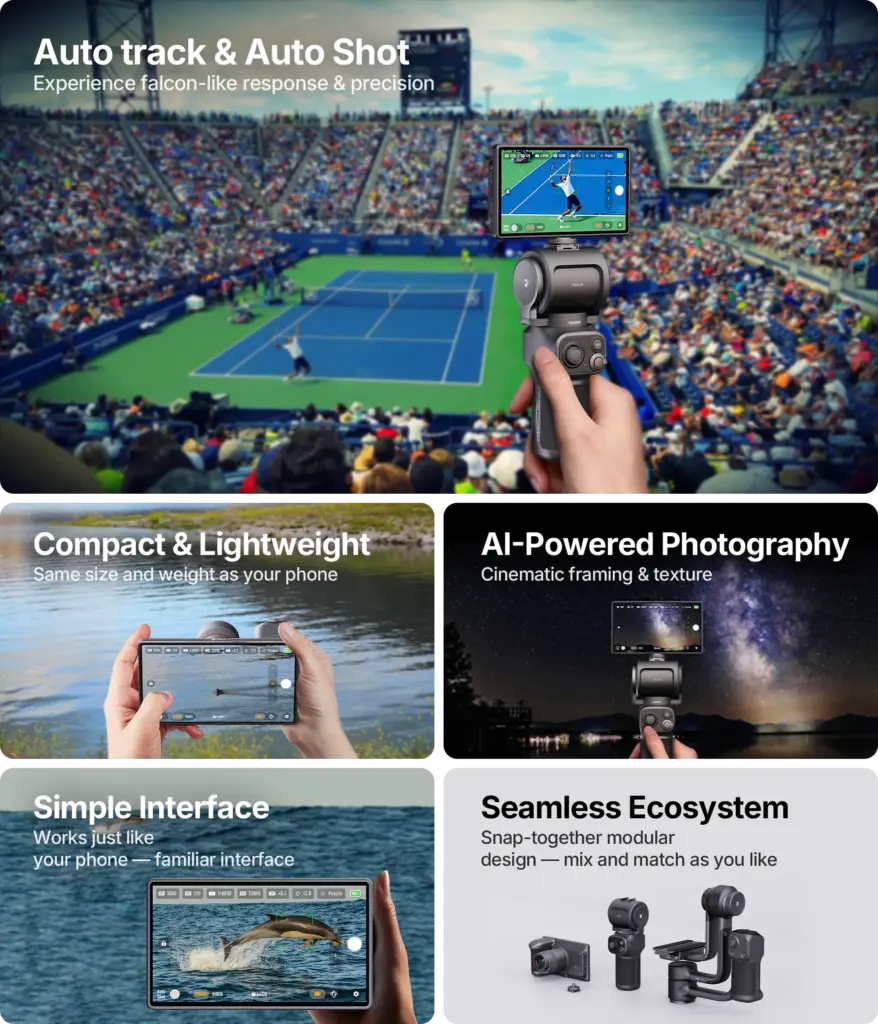 – RocX Handle: θυμίζει DJI Osmo Pocket, ενσωματώνει την κάμερα και προσφέρει auto-framing και auto-tracking σε compact μορφή.