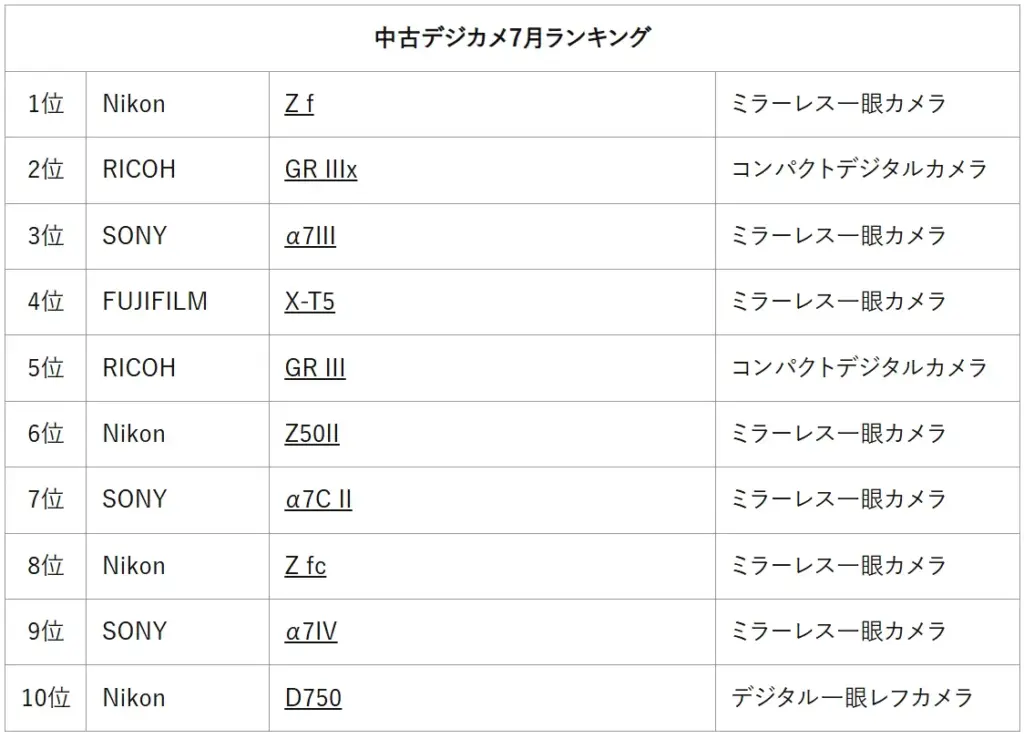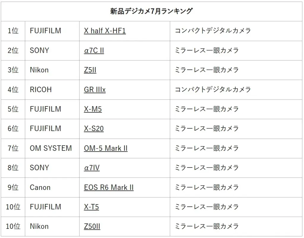 Η λίστα του Map Camera με τις 10 πιο δημοφιλείς νέες κάμερες για τον Ιούλιο είναι αρκετά πολυποίκιλη, με έξι διαφορετικές εταιρείες να εμφανίζονται: Fujifilm, Sony, Nikon, Ricoh, OM System και Canon.
