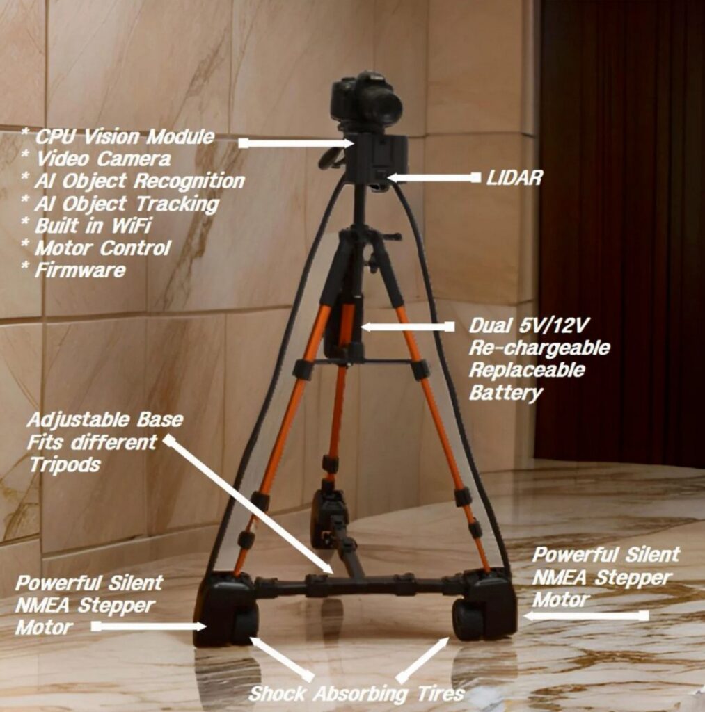 Τι ακριβώς όμως περιλαμβάνει η πατέντα αυτή; Στην ουσία πρόκειται για ένα κινούμενο ρομποτικό σύστημα που μπορείτε να τοποθετήσετε πάνω του ένα τρίποδο και μια κάμερα (ή smartphone) και να προγραμματίσετε τη βιντεοσκόπηση που θέλετε να κάνει για εσάς. Διαθέτει σύστημα Lidar, προηγμένη παρακολούθηση θέματος και αντικειμένου μέσω τεχνητής νοημοσύνης (AI tracking), ενώ υπάρχει και ένα κεντρικό μοτέρ όπου πάνω του μπορείτε να στηρίξετε την κάμερα σας με υποστήριξη για ελεύθερη κίνηση (σαν gimbal tracking), με δυνατότητα περιστροφής 360 μοιρών. Να πούμε ότι στο σύστημα αυτό υπάρχει μια κάμερα αλλά δεν είναι για βιντεοσκόπηση, καθότι έχει σχεδιαστεί για να ενσωματώνει όλα τα απαραίτητα συστήματα ανίχνευσης κλπ.