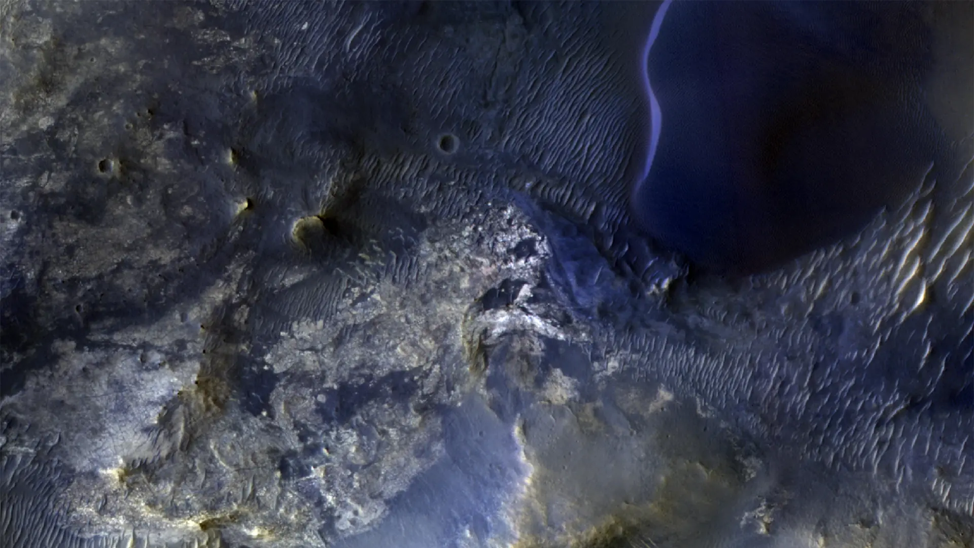 Για να γιορτάσει το ορόσημο των 100.000 εικόνων, η ομάδα της HiRISE δημιούργησε και ένα λεπτομερές Digital Terrain Model, βασισμένο σε στερεοσκοπικά δεδομένα. Το τρισδιάστατο αυτό μοντέλο αναδεικνύει τους κυματοειδείς λόφους που συνορεύουν με τον κρατήρα Jezero και συγκαταλέγονται στα αρχαιότερα εδάφη του Άρη. Η μετακίνηση της σκοτεινής άμμου από τον άνεμο έχει απομακρύνει μεγάλο μέρος της επιφανειακής σκόνης, αποκαλύπτοντας εντυπωσιακές χρωματικές διαφοροποιήσεις στο έδαφος, όπως φαίνονται στις ψευδοχρωματικές αποδόσεις της εικόνας.