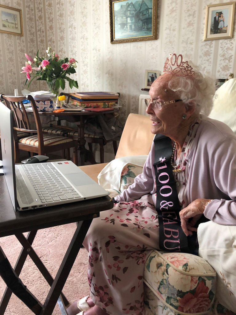 Ο ενθουσιασμός της μαμάς μου στα 100α γενέθλιά της έχοντας λάβει μια κάρτα από την Αυτού Μεγαλειότητα τη Βασίλισσα, με την οποία μοιράζεται τα γενέθλιά της και γιορτάζει συνομιλώντας μέσω του υπολογιστή με όλη την οικογένεια κατά τη διάρκεια του lockdown.