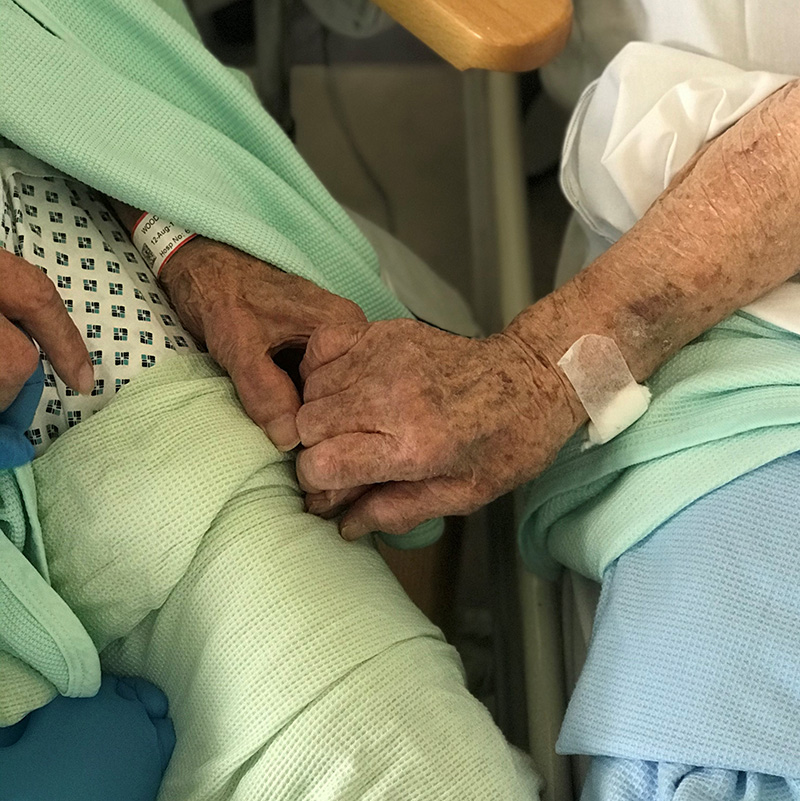 Οι παππούδες μου, η Pat και ο Ron Wood, παντρεύτηκαν πριν από 71 χρόνια την Ημέρα του Αγίου Γεωργίου. Τον Μάιο του 2020 εισήχθησαν με μια εβδομάδα διαφορά στο Νοσοκομείο Worthing λόγω του Covid. Στην αρχή ήταν ξεχωριστά, αλλά σύντομα επανενώθηκαν. Το ευγενικό προσωπικό ένωσε τα κρεβάτια τους και τους έδωσε το δικό τους δωμάτιο. Πέρασαν τις τελευταίες μέρες τους ακριβώς εκεί που έπρεπε να είναι και ακριβώς όπως είχαν περάσει τα τελευταία 71 χρόνια… μαζί. Η Pat πέθανε στον ύπνο της, ξαπλωμένη δίπλα στον αγαπημένο της Ron, ο οποιός την ακολούθησε πέντε ημέρες αργότερα. Μαζί, κρατώντας για πάντα τα χέρια τους. Εκτίμησαν τα μικρά πράγματα και δεν πήραν τίποτα ως δεδομένο. Η δυνατότητα να αγγίζονται όταν είχαν μείνει τόσα λίγα ήταν ένα δώρο. Ήταν ο μόνος τρόπος να δείξουν την αγάπη και την αφοσίωσή τους. Τράβηξα αυτή τη φωτογραφία με γάντια κοιτώντας μέσα από μία ασπίδα. Με παρηγορεί τόσο πολύ να γνωρίζω ότι σε έναν κόσμο όπου πρέπει να μείνουμε μακριά ο ένας από τον άλλο, είχαν όλα όσα ήθελαν στα χέρια τους. Αυτή ήταν η τελευταία φορά που τους είδα.