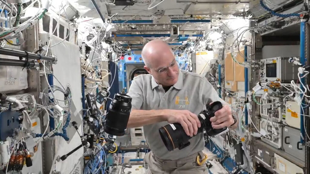 Σχετικά με το πως αλλάζει φακούς, ο Pettit μας κάνει μια επίδειξη αλλάζοντας φακό σε μια Nikon Z9 κάμερα (μια από αυτές που χρησιμοποιεί συνεχώς στον ISS). Εδώ στη Γη, πολλές φορές η διαδικασία αλλαγής φακού μπορεί να γίνει ιδιαίτερα αγχωτική ειδικά όταν πρέπει να συνεχιστεί η φωτογράφιση ή βιντεοσκόπηση με διαφορετικό εστιακό μήκος ανάλογα με τις εκάστοτε ανάγκες. Αυτό απαιτεί γρήγορες κινήσεις άλλα πέρα από αυτό, υπάρχει πάντα και το άγχος της ασφάλειας. Να γίνει δηλαδή η αλλαγή φακού γρήγορα χωρίς να πέσει η κάμερα ή ο φακός κάτω, ή να μπει σκόνη, βρωμιά, υγρασία στην κάμερα από τη διαδικασία αλλαγής. Στο διάστημα τα πράγματα είναι τελείως διαφορετικά!