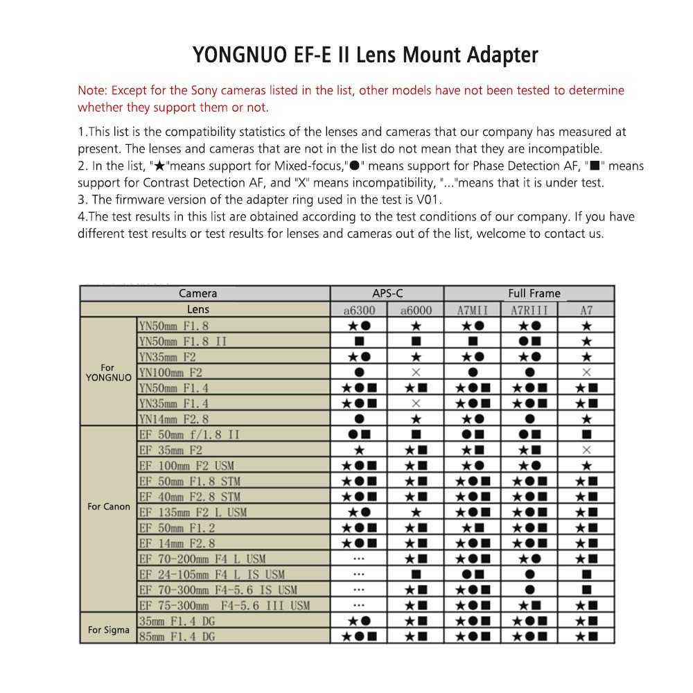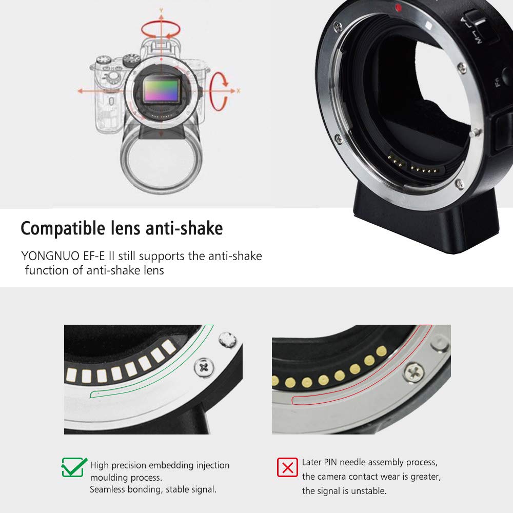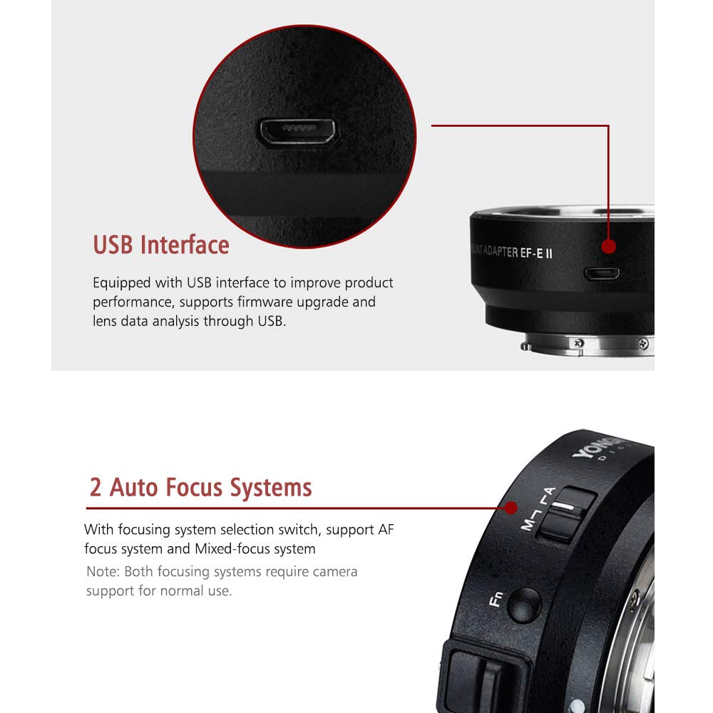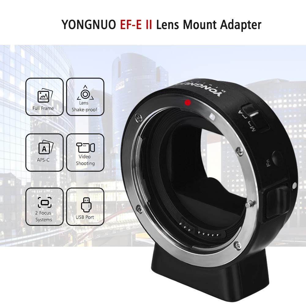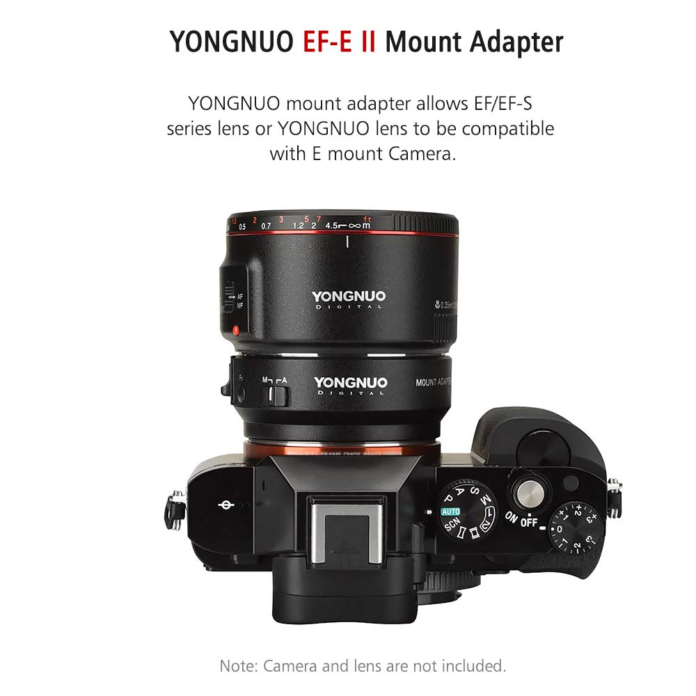 Πρόκειται για τον YONGNUO EF-E II, την δεύτερη έκδοση του adapter της, με τον οποίο μπορούμε να βάλουμε φακούς της Canon ή άλλων εταιρειών, τόσο EF για Full Frame μηχανές, όσο και EF-S για APS-C μηχανές, σε οποιαδήποτε μηχανή της Sony με E-mount.