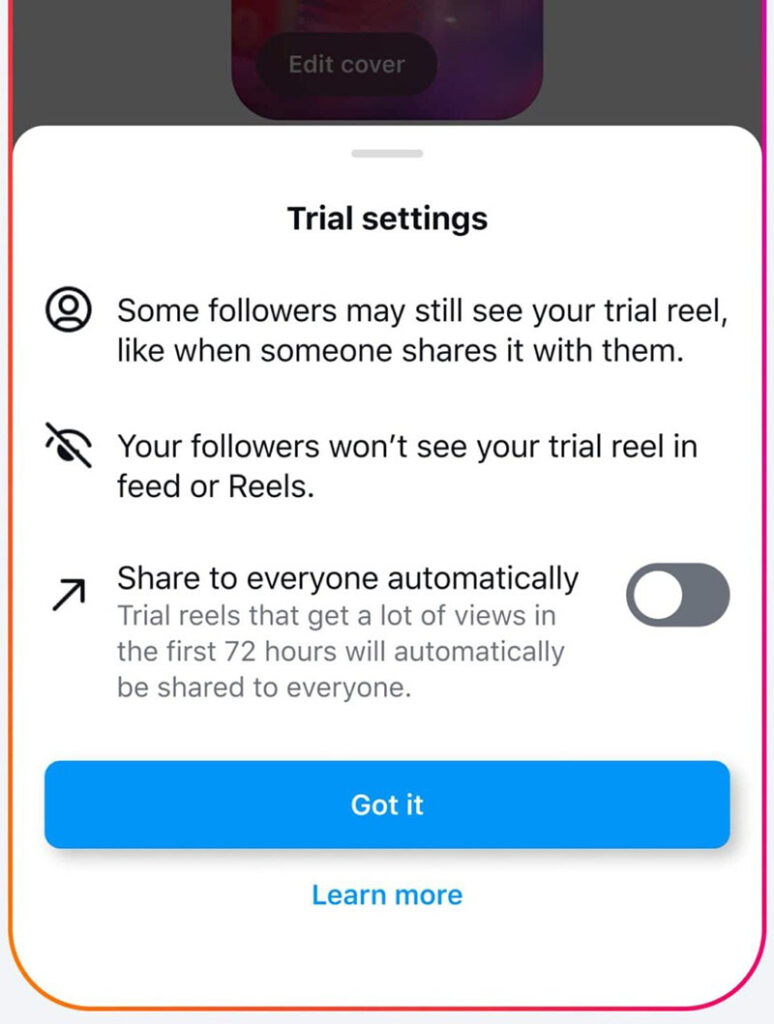 Εάν ένα Trial reel σας έχει καλή απόδοση, μπορείτε στη συνέχεια να επιλέξετε να το μοιραστείτε με όλους. Να συμπεριλάβετε δηλαδή όλους τους ακόλουθους σας ώστε να αυξηθεί περαιτέρω η απήχησή του. Αυτό μπορείτε να το κάνετε και αυτόματα. Να “πείτε” δηλαδή στο Instagram να μοιράζεται αυτόματα ένα Trial reel με τους ακόλουθους σας εάν η πλατφόρμα κρίνει ότι έχει καλή απόδοση με βάση τις προβολές που λαμβάνει εντός των πρώτων 72 ωρών. Φυσικά, αυτή η ρύθμιση μπορεί να αλλάξει ανά πάσα στιγμή όταν θέλετε.