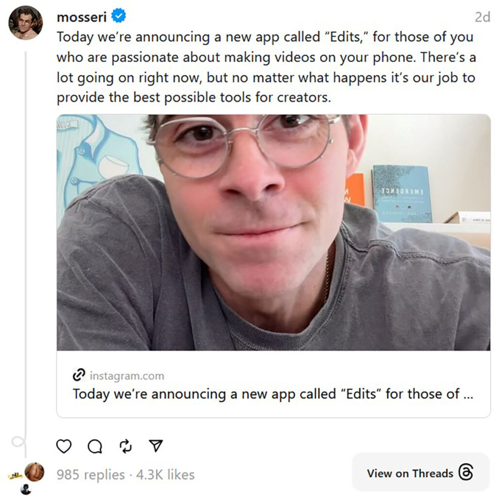 Ο επικεφαλής του Instagram Adam Mosseri ανακοίνωσε ότι η εταιρεία λανσάρει το Edits ως λύση επεξεργασίας βίντεο στην πλατφόρμα.