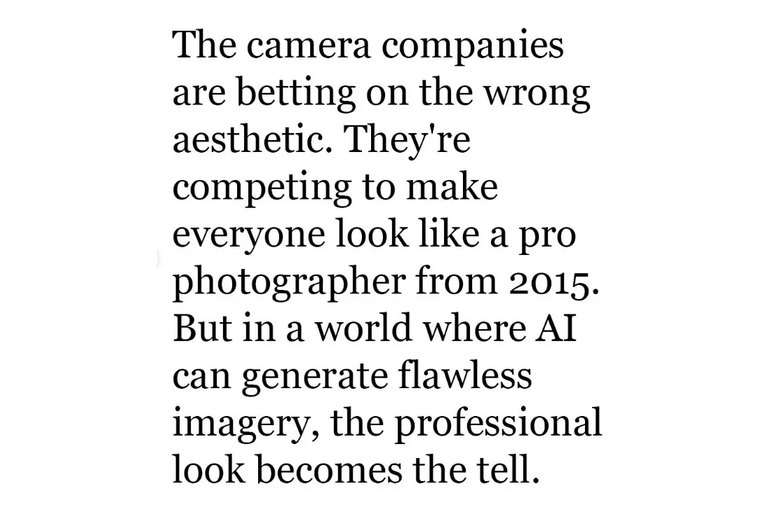 Κάπου εκεί στρέφει τα βέλη του στις εταιρείες καμερών. Σύμφωνα με τον ίδιο, οι κατασκευαστές ανταγωνίζονται για να κάνουν τους πάντες να μοιάζουν με επαγγελματίες φωτογράφους «μιας άλλης εποχής»: περισσότερα megapixels, όλο και πιο επιθετικό image processing, τεχνητό θόλωμα φόντου που μιμείται φακούς με μικρό βάθος πεδίου. Το αποτέλεσμα είναι εντυπωσιακό, αλλά προβλέψιμο.
