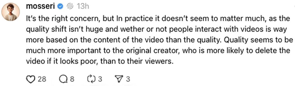 Ο επικεφαλής του Instagram Adam Mosseri δήλωσε ότι η δημοτικότητα ενός βίντεο μπορεί να επηρεάσει την ποιότητα του.