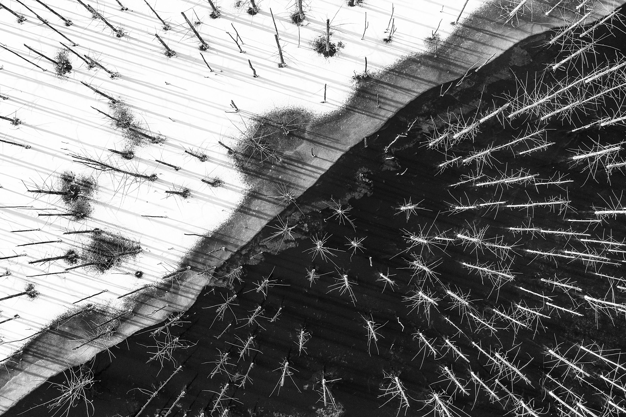 Γιν και Γιανγκ. Αυτή είναι μια εναέρια θέα της λίμνης Cuejdel λίγο πριν τον πλήρη παγετό. Το Cuejdel είναι το μεγαλύτερο φυσικό φράγμα στη Ρουμανία, αυτή είναι η εξήγηση για αυτά τα δέντρα.