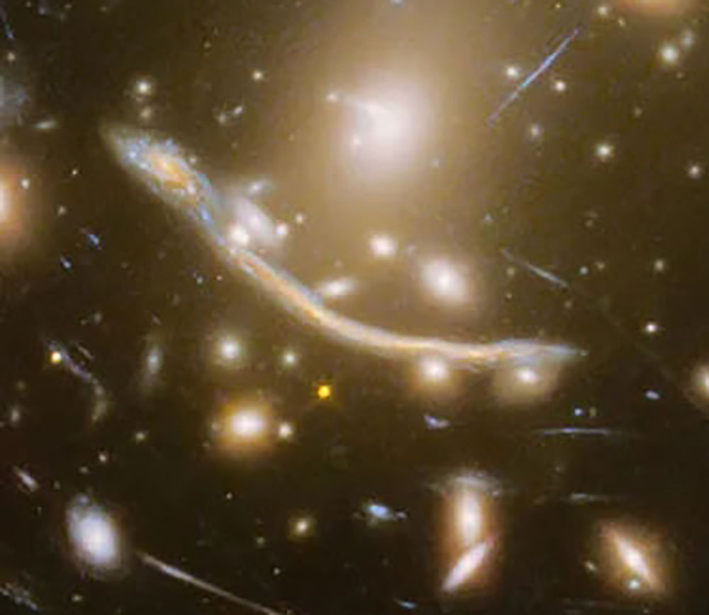 Τα 44 αυτά νέα άστρα (η μεγαλύτερη συλλογή άστρων που έχει παρατηρηθεί ποτέ στο μακρινό σύμπαν) ανήκουν σε έναν απομακρυσμένο “κρυμμένο” γαλαξία που βρίσκεται 6,5 δισεκατομμύρια έτη φωτός μακριά μας με ονομασία “Dragon”, του οποίου το φως έχει παραμορφωθεί λόγω του φαινομένου του βαρυτικού φακού (φαίνεται παραμορφωμένος σαν “στραβό μακαρόνι” στο κέντρο της εικόνας και λίγο προς τα κάτω και αριστερά).