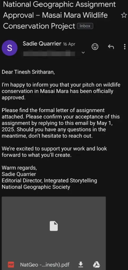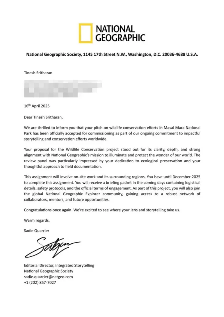 Ο 32χρονος Tinesh Sritharan πίστεψε ότι είχε επιλεγεί για το περίφημο πρόγραμμα National Geographic Explorer με σκοπό να καταγράψει τη Μεγάλη Μετανάστευση στο Masai Mara της Κένυας. Ο φωτογράφος είχε καταθέσει πρόταση με τίτλο “Echoes of the Savannah” στις 4 Νοεμβρίου 2024, την οποία υπέβαλε μέσω email στη Sadie Quarrier, διευθύντρια αφήγησης του National Geographic.
