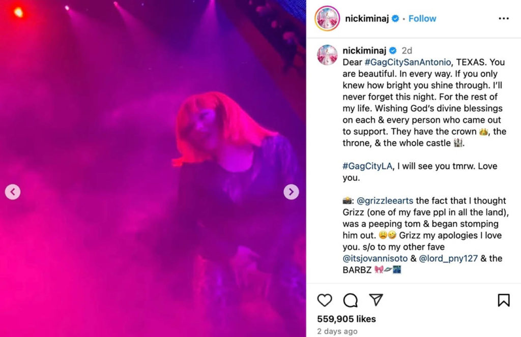 Στη συνέχεια, η κάμερα του φωτογράφου εκτοξεύεται (λόγω κλωτσιάς) από τα χέρια του και φαίνεται να πέφτει κάτω από τη σκηνή. Μόνο που η διάσημη τραγουδίστρια έκανε λάθος στην εκτίμησή της διότι ο συγκεκριμένος φωτογράφος δεν την τραβούσε ακατάλληλα πλάνα ή με χυδαίο τρόπο. Ο φωτογράφος ήταν ο Alex Loucas, γνωστός και ως “Grizz”, Αναγνωρίζοντας το λάθος της, η Minaj ζήτησε συγγνώμη που κλώτσησε την κάμερα από τα χέρια του Loucas και μάλιστα έκανε δημόσια ανάρτηση στο Instagram:
