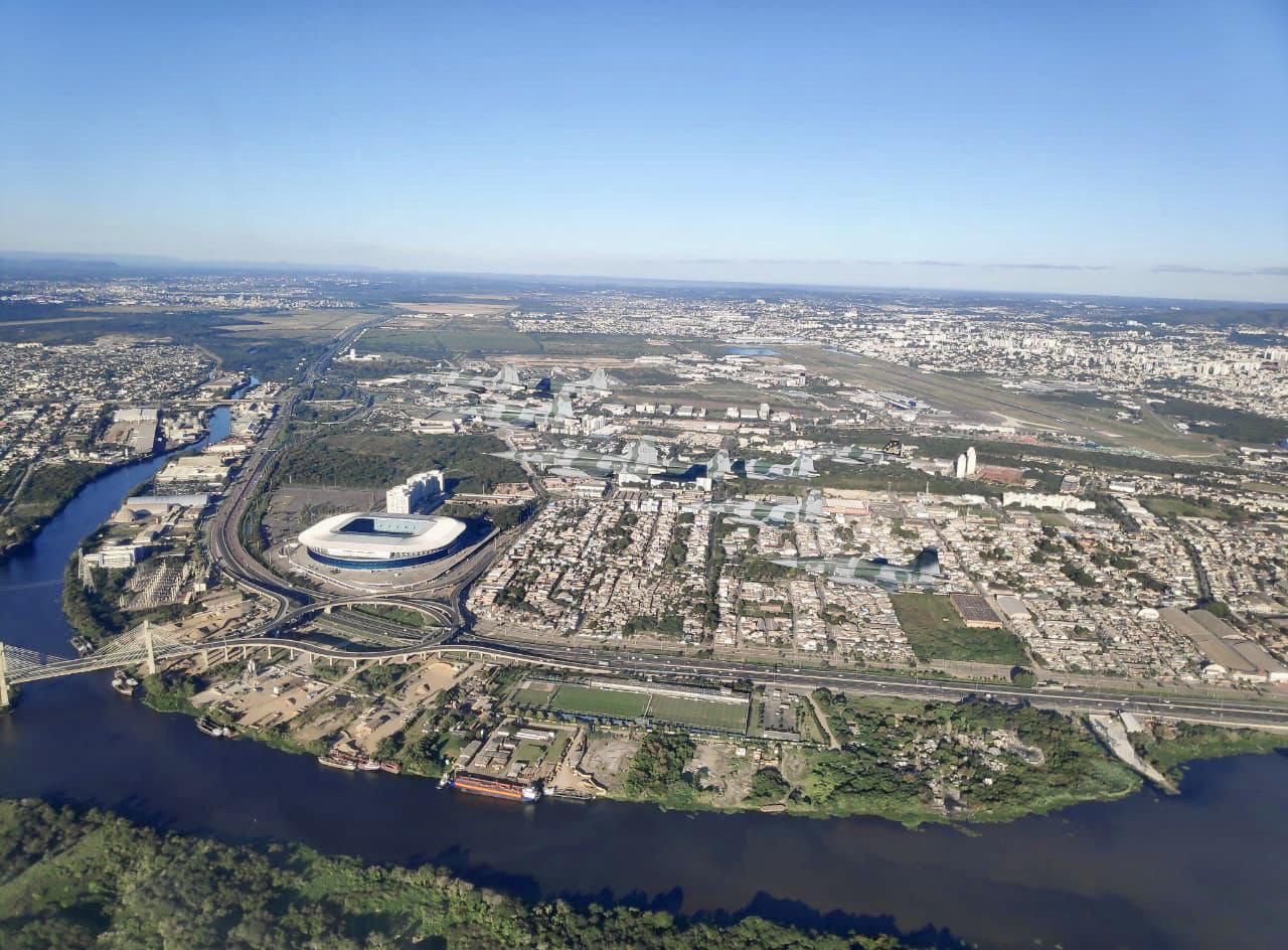 Στην εικόνα, που δείχνει τον ποταμό Guaíba στην πολιτεία Ρίο Γκράντε ντο Σουλ με φόντο το στάδιο και την πόλη, πετούν εννέα μαχητικά F-5M. Παρά το μέγεθός τους, είναι σχεδόν αδύνατο να τα ξεχωρίσει κανείς με την πρώτη ματιά.