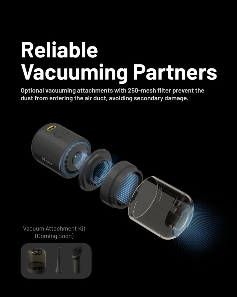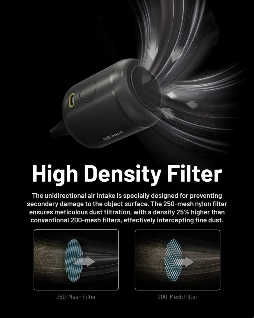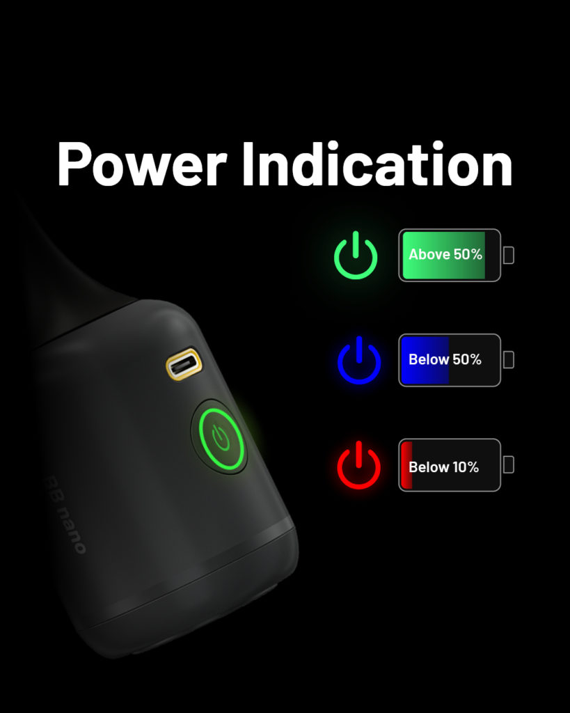 Το νέο BBnano φορτίζεται χρησιμοποιώντας ένα τυπικό καλώδιο USB-C που προσφέρει 5V στα 2A, ενώ διαθέτει ένδειξη για να ξέρετε πόση φόρτιση απομένει ακόμη. Το σύμβολο “On” ανάβει πράσινο όταν είναι πάνω από 50%, μπλε όταν είναι κάτω από 50%, και κόκκινο όταν είναι κάτω από 10%. Σύμφωνα με την εταιρία, προσφέρει ισχυρή εισαγωγή αέρα μονής κατεύθυνσης με φίλτρο υψηλής πυκνότητας, για να αποτρέπει τυχόν ζημιές στην επιφάνεια που χρησιμοποιείται.