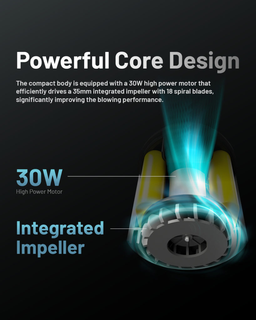 Τροφοδοτείται από μια εσωτερική μπαταρία με χωρητικότητα 960mAh που φορτίζεται μέσω USB-C. Διαθέτει κινητήρα 30W με ταχύτητα περιστροφής 40.000 RPM με μέγιστη ταχύτητα αέρα 40 χιλιόμετρα την ώρα, για να απομακρύνει αποτελεσματικά τη σκόνη από τον φακό, το σώμα της κάμερας ή άλλα κομμάτια του εξοπλισμού σας (υπάρχει και low λειτουργία με ταχύτητα 15 χιλιόμετρα την ώρα). Μια πλήρης φόρτιση προσφέρει έως και 90 χρήσεις (καθαρισμούς) ενώ στην χαμηλή ένταση φτάνει μέχρι τους 210 καθαρισμούς..
