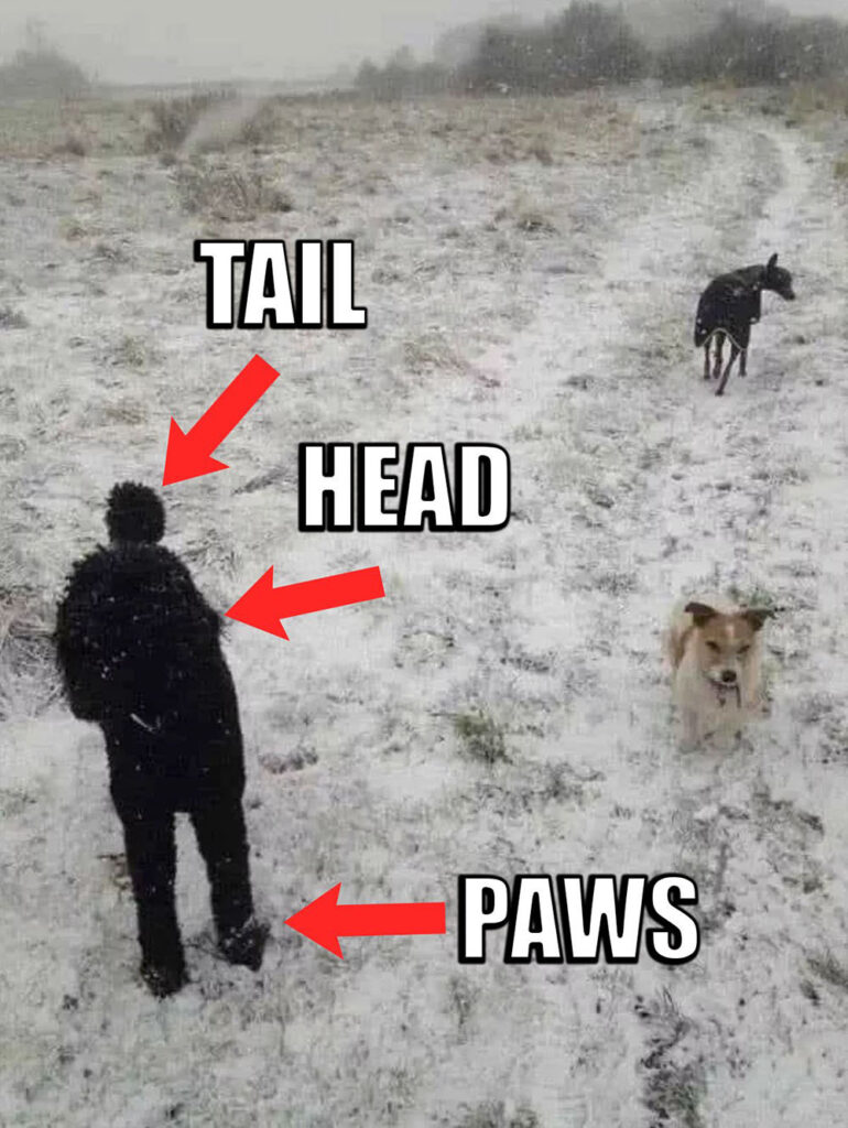 Πρόκειται για μια εκπληκτική οπτική ψευδαίσθηση που πραγματικά οδηγεί τον θεατή στο συμπέρασμα ότι πρόκειται για άνθρωπο. Αυτό συμβαίνει λόγω της ιδιαίτερης οπτικής γωνίας που έχει τραβηχτεί η φωτογραφία αυτή. Το μαύρο σκουφί του “ανθρώπου” είναι η ουρά του σκύλου, ενώ έχει τραβηχτεί με τέτοια μοναδική γωνία που τα πόδια του σκύλου μοιάζουν με αυτά ενός ανθρώπου (βοηθάει πολύ και το στήσιμο του).